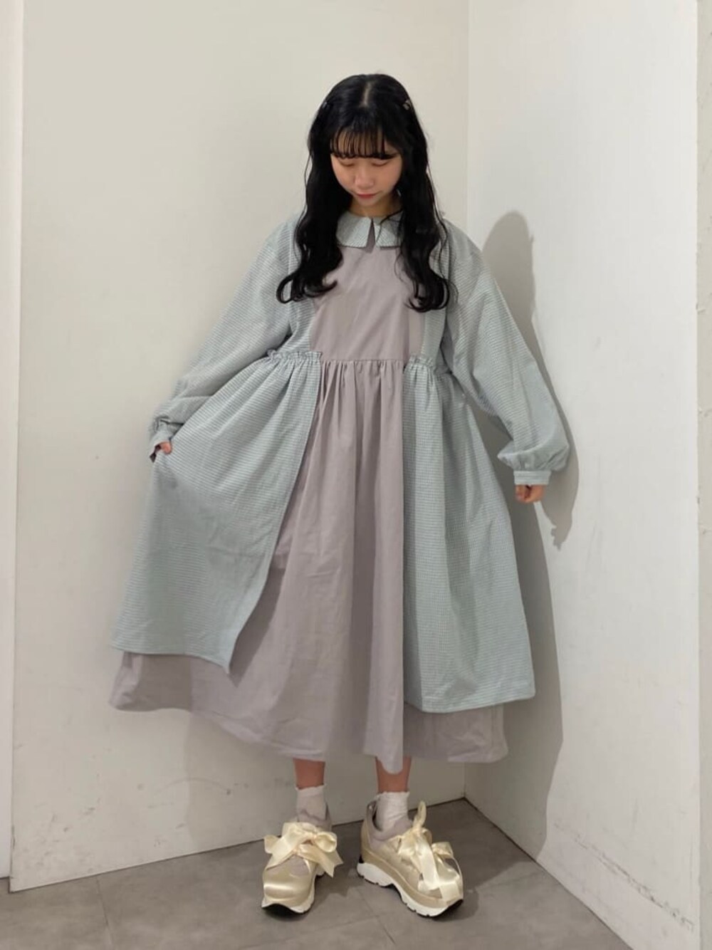 kotochi(merry jenny)のワンピース「ギャザーチェックコンビワンピース」を使ったコーディネート