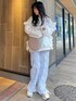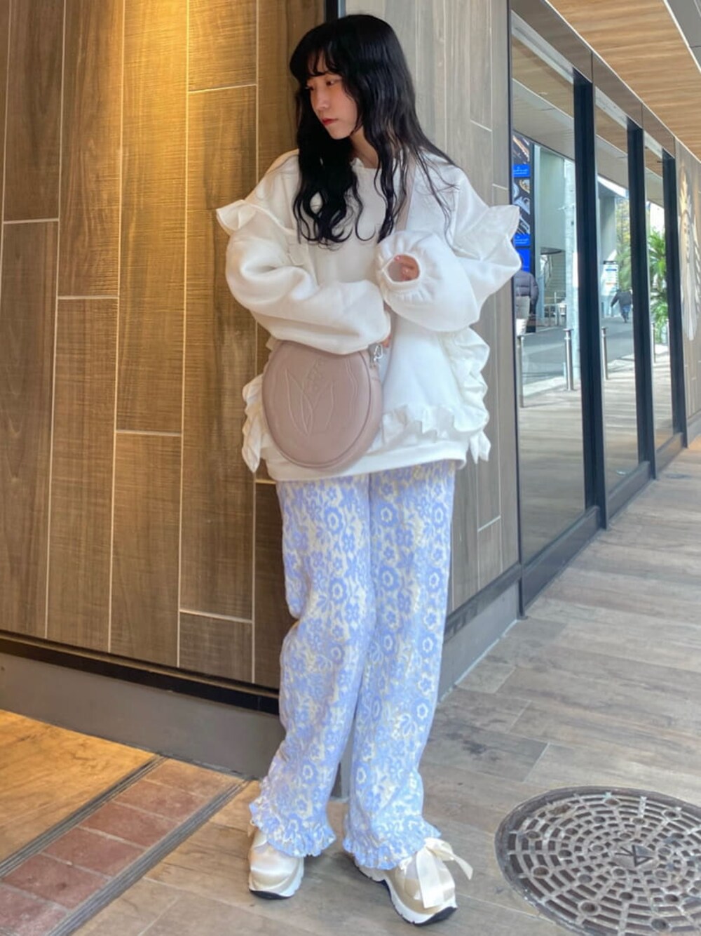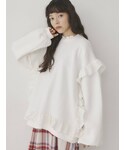 春のゆるっと楽ちんコーデ♡ 無地のトレーナーには総レースのパンツを合わせて、シンプルになり過ぎないようにするのがおすすめ! トレーナーは絶妙なサイズ感で、お腹や腰周りをカバーしてくれる優秀アイテム。 ぐるりと円を描くようにあしらわれたフリルで、360°どこから見ても可愛い1着です。 パンツはウエスト部分がゴムになっておりノンストレスなうえに、繊細なレースのおかげでこなれ感も演出してくれます。 バッグはピンク色、シューズはアイボリーを選んで水色×ピンク×白の春らしい色合いを意識しました。
