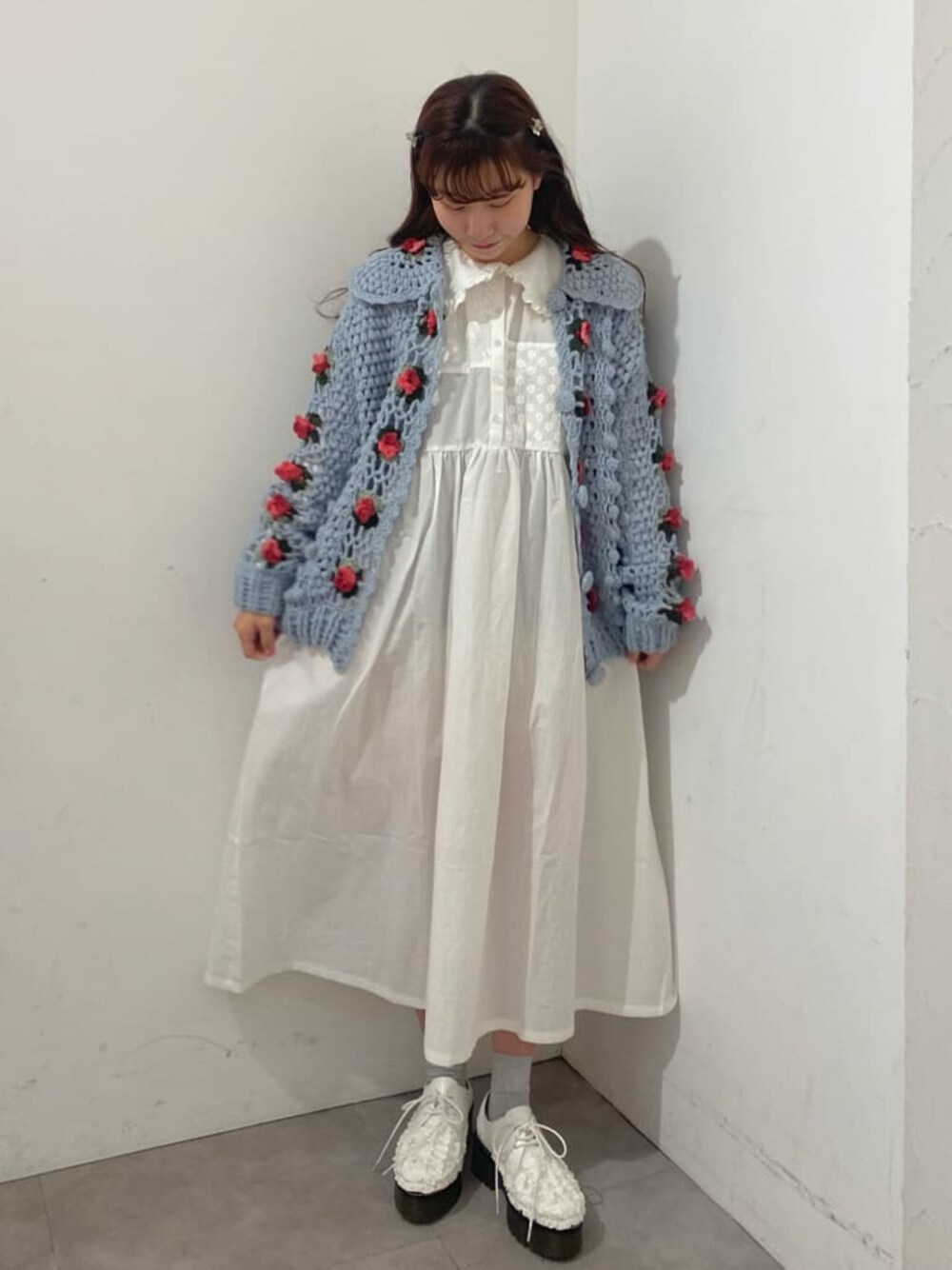 水色のカーディガンをメインに、他のアイテムは白色で統一しました♡ merry jenny定番のクロシェカーディガンは、春や秋などアウターに悩む時期に大活躍します。 前だけでなく袖や襟にもお花が付いており、360°どこから見ても可愛い1着です。 新色のブルーは、お肌をワントーン明るく見せてくれますよ♡ ワンピースはボディラインの出ないゆったりシルエットなので、おしり周りや足など気になる部分を隠してくれて華奢見え効果抜群!