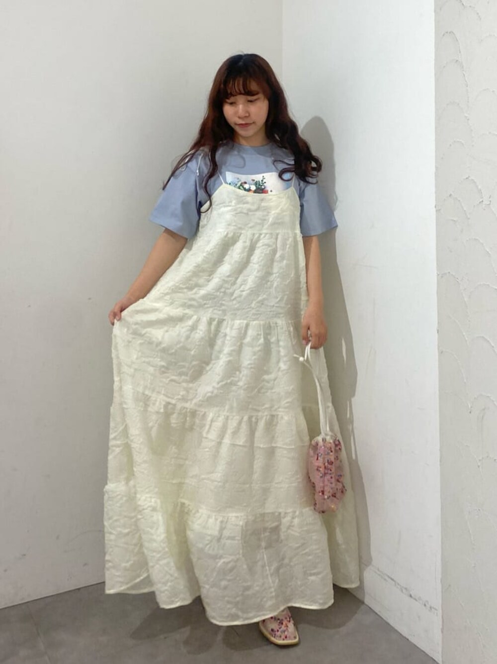キャミワンピースからちらりと除く猫ちゃんがとってもcute♡ ワンピースは肩紐が調節可能なので、低身長さんでも着用していただけます。 Tシャツはルーズすぎないサイズ感で、合わせるボトムを選びません。 ガーリーさんはつけ襟を合わせるのも、女の子らしさが増しておすすめです♡ バッグとシューズは同じスパンコールのものを選びました。 バッグはサッと持てるコンパクトなサイズでちょっとしたお出かけにもぴったり。 シューズはクッション性があって、長時間歩いても足が疲れません。