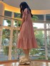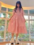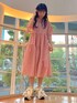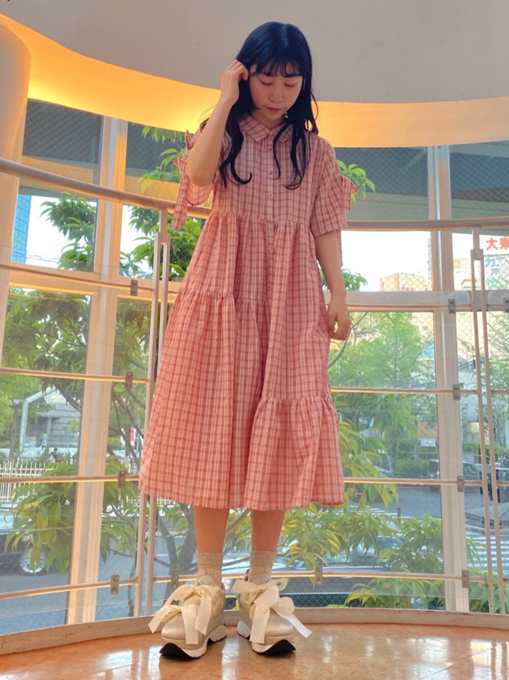 【暑い夏にぴったりな楽ちんワンピース♡】 締め付け感の無いシルエットと、ぽこぽことした立体的な素材で肌に密着することが無く汗をかきやすいこれからの季節にもさらっと快適に着用していただけます。 カジュアルなイメージのチェック柄も、アシンメトリーになったティアードや袖のリボンで女の子らしい1着に。 袖のリボンからは腕がちらりと覗くデザインになっており、二の腕が気になるけど夏だし肌見せしたい!という方にもおすすめです。 ワンピースのカジュアルガーリーな雰囲気にあわせて、シューズはリボンのスニーカーを合わせました。 足首が見えるお洋服の時はボリュームのあるシューズを選ぶと足が細く見えるので、真似してみてください♡