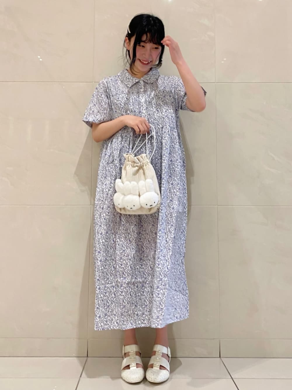 チューリップ柄のワンピースに白の小物を合わせて、爽やかなコーディネートにしてみました♡ サラッと1枚着るだけでコーデがおしゃれに決まる総柄ワンピース。 淡い色のチューリップ柄が柔らかく可愛らしい印象なので、総柄でも派手になり過ぎずに着ていただけます。 高い位置で切り替えが入っているので脚長効果も抜群ですよ! ミッフィーちゃんのポシェットは小さめのサイズ感なので、ポーチとしてもお使いいただけます。 夏はクリアバッグにいれて使うのもおすすめ♡