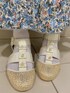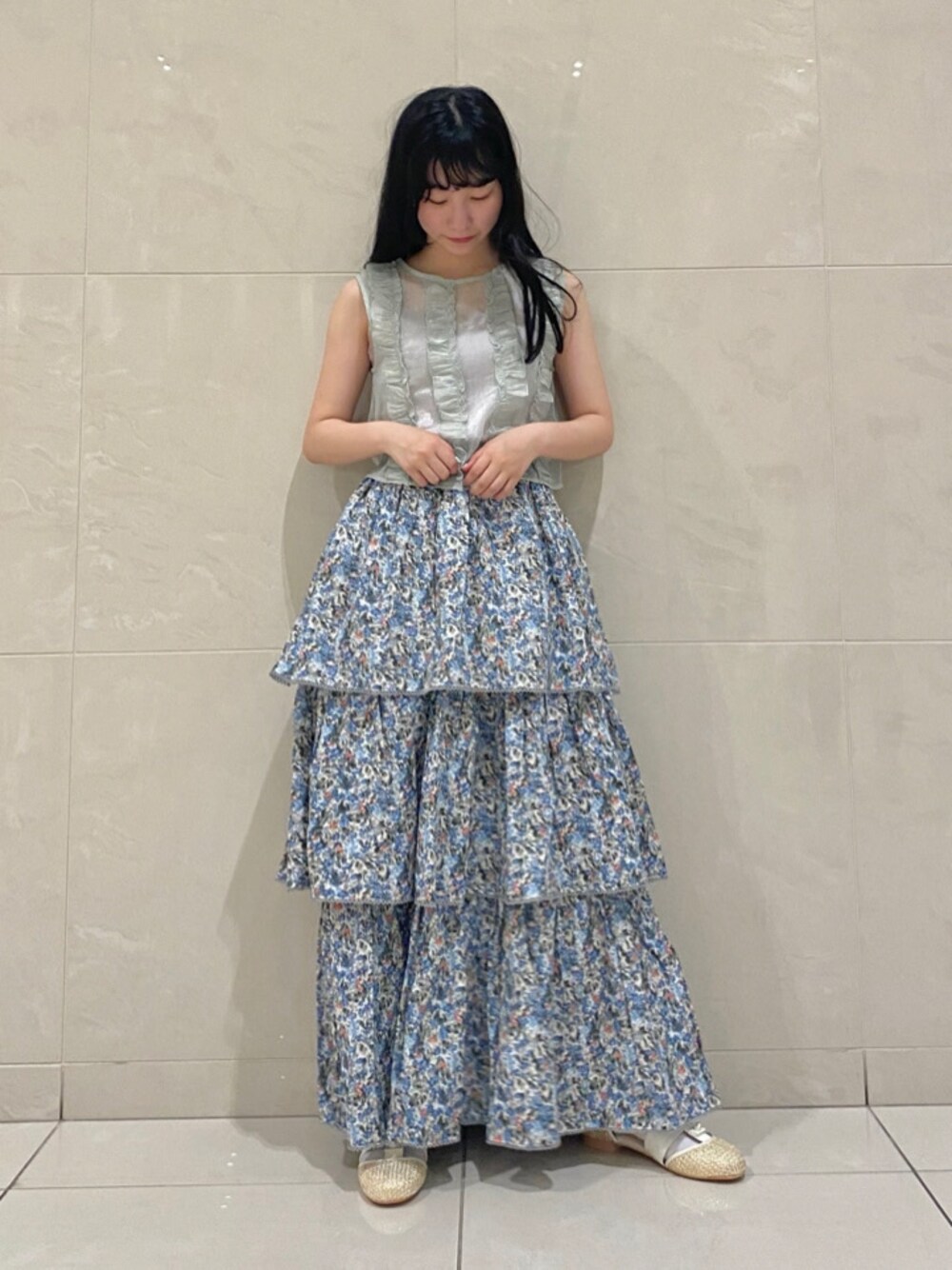 ブルー×グリーンの爽やかコーデ♡ ティアードスカートにボリュームがあるので、トップスはコンパクトなブラウスを合わせてバランスよく見えるようにしました。 透け感のあるブラウスはインナーによって雰囲気を変えていただけるので、飽きることなく着ていただけます。 フリル部分もシアー感がある素材を使っていて主張し過ぎないので、ボトムに悩む心配もありません。 私のようにフリルが沢山付いているスカートと合わせても、うるさくならずに着ていただけますよ♡ スカートは総柄&ボリュームのあるティアードで、履くだけでおしゃ見えする万能アイテム。 ウエスト部分はゴムになっているので、体型問わず履いていただけます。 太ももやおしり周りなど気になる部分は全て隠してくれるうえに、下半身にボリュームが出る対比で上半身の華奢見えも叶いますよ♡ シューズはクッション性があり、長時間の移動にも◎ 日差しに照らされてキラキラと光る箔が綺麗で、思わず足元を眺めてしまいます。
