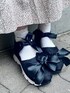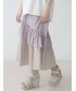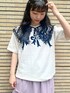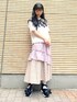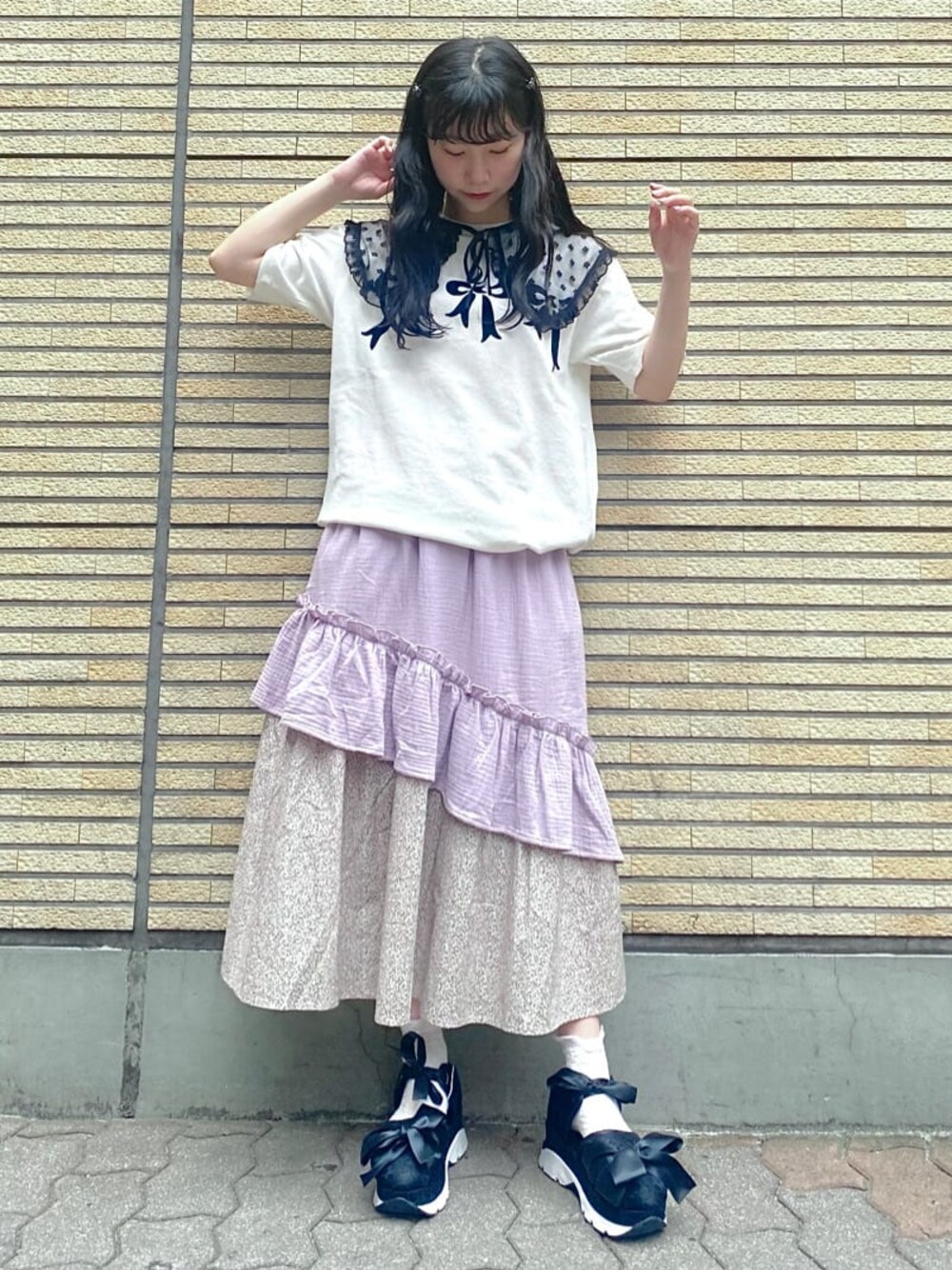 ガーリーTシャツコーデ♡ カジュアルなイメージのTシャツもリボンプリントで女の子らしく。 私はリボンと同色のつけ襟を付けて、更にガーリーに仕上げました。 つけ襟は後ろにmerryjennyのロゴが入っており、バックスタイルまで可愛いですよ! ボトムはふんわり広がるティアードスカートを選びました。 ガーゼ素材×花柄で履くだけでコーデ全体が柔らかい雰囲気になります。 ウエストはゴムになっているので履き心地も◎ シューズはつけ襟と合わせて黒色のレーススニーカーを選びました。