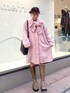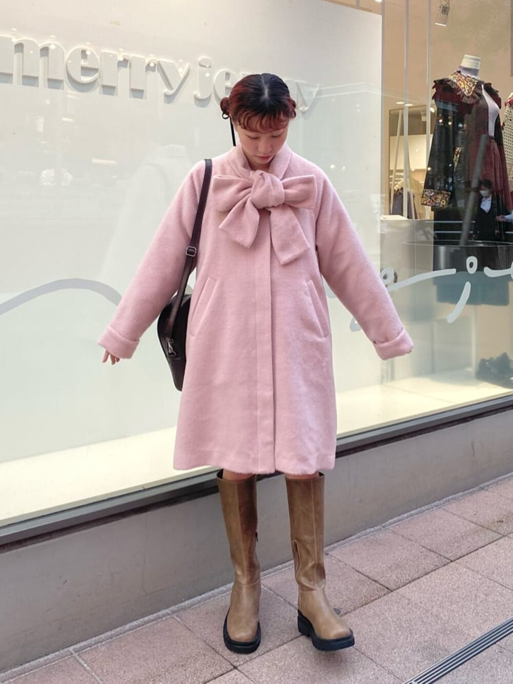 大きなリボンがインパクト大なコートは、身長154cmで膝の真ん中あたりのミニにもロングにも合わせられる絶妙な丈感。 私はロングブーツと合わせてトレンド感のあるスタイリングにしました♡ バッグはペットボトルもすっぽり入る大容量で、荷物が多めの方にもおすすめのアイテムです!