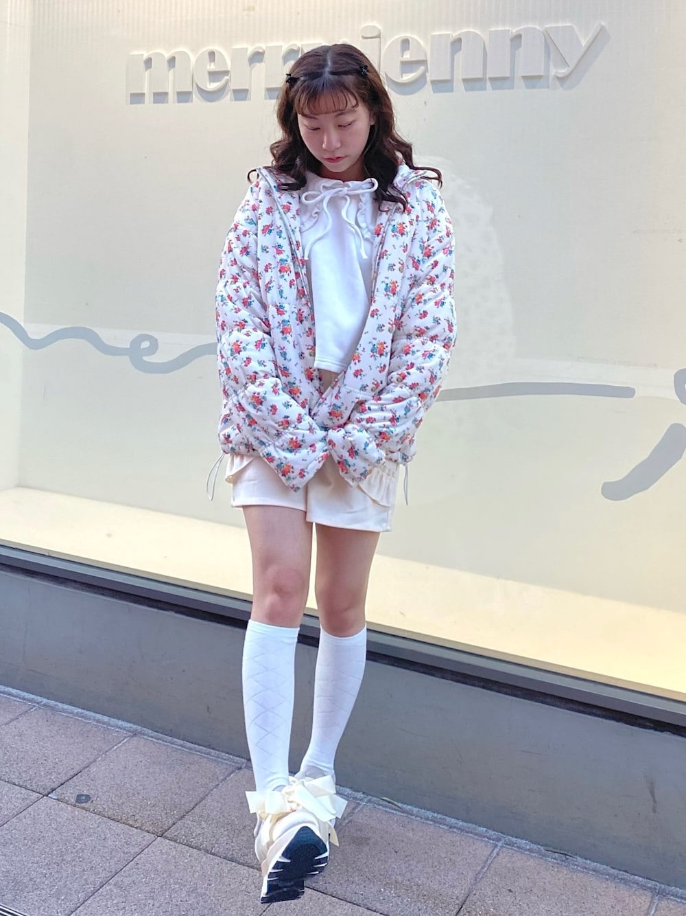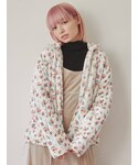 kotochi(merry jenny)のナイロンジャケット「floralベロアキルトジャケット」を使ったコーディネート
