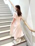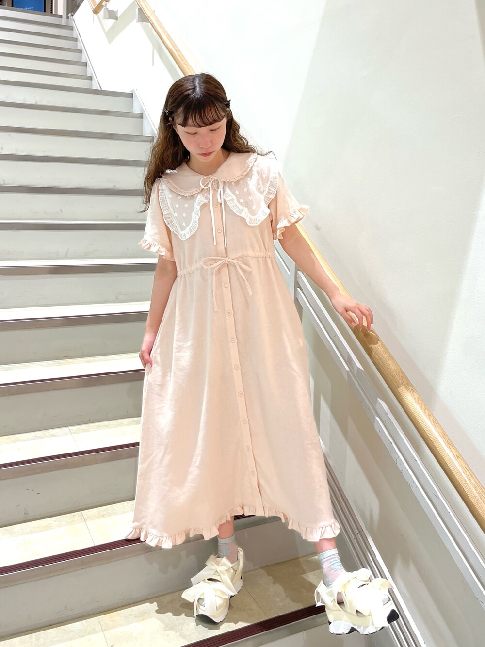 胸元のうさぎちゃん刺繍がポイントのワンピース。 ウエストの絞り具合でシルエットを変えていただけます♡ 更にガーリーにしたい方は、画像のようにレースのつけ襟を重ねるのがおすすめ! シューズもリボンのサンダルを合わせて、隅々まで女の子らしいコーディネートにしました💞