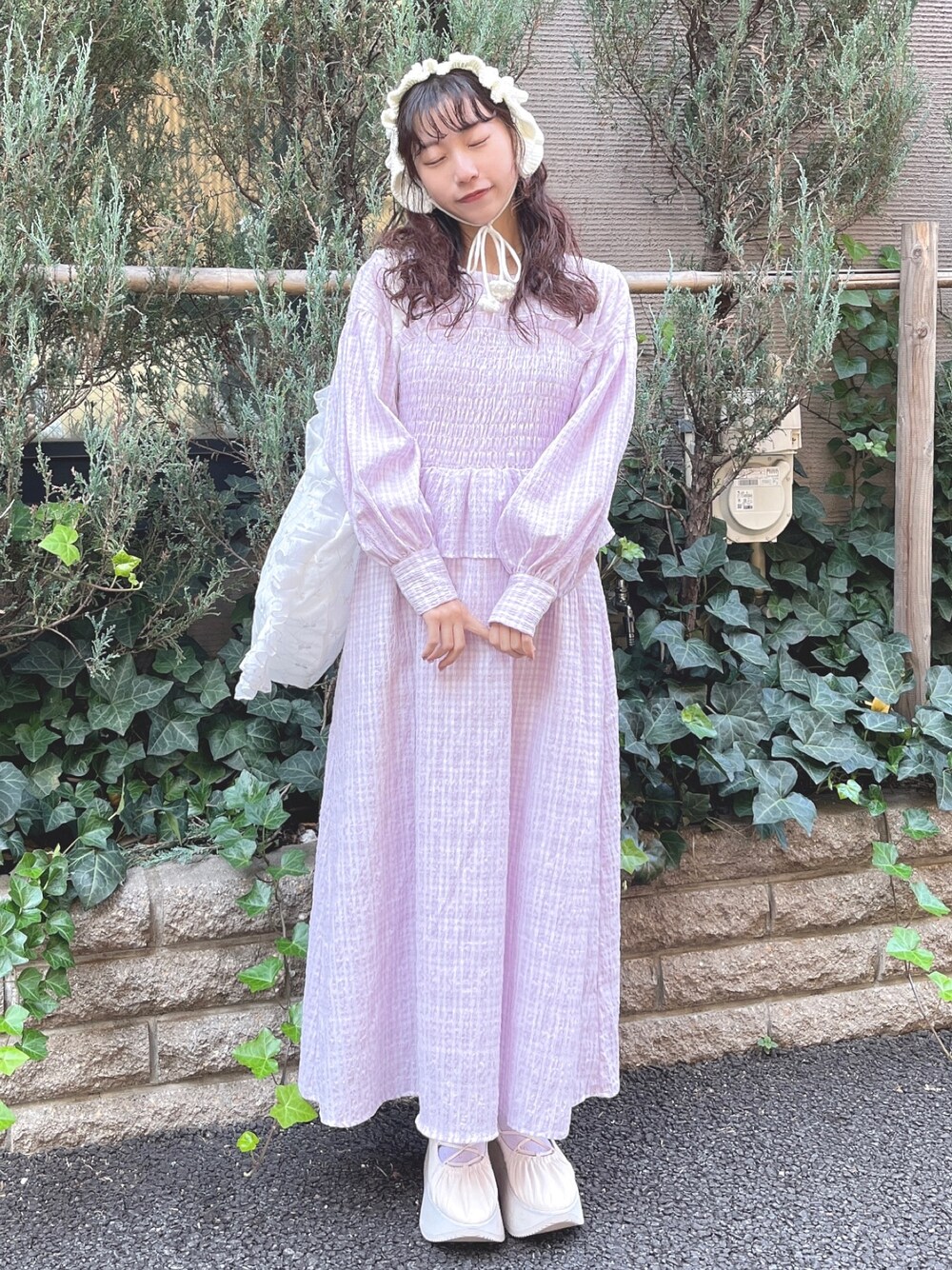 春らしいラベンダーカラーのチェック柄ワンピースは、立体的な素材を使用しておりシワを気にせずに着用していただけます。 ライブ参戦の際にもおすすめな、ハート型バッグは肩紐が長めに作られているので肩から掛けて持つことが出来ますよ♡ シューズもバッグと同じ白色を選んで、コーデに統一感が出るようにしました! シーズンレスで履いていただける、万能シューズです。