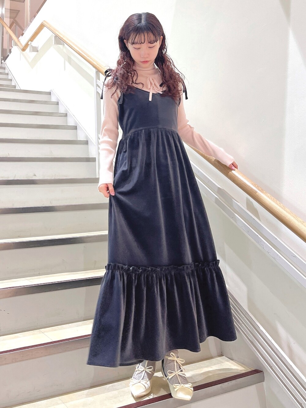 オケージョンでも活躍するベロア素材のキャミワンピース。 ウエスト位置からフレアに広がるシルエットなので、大人っぽくなり過ぎずに着用していただけます♡ 肩紐で丈の調節、後ろのリボンで身幅の調節が可能です。
