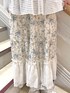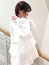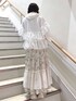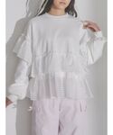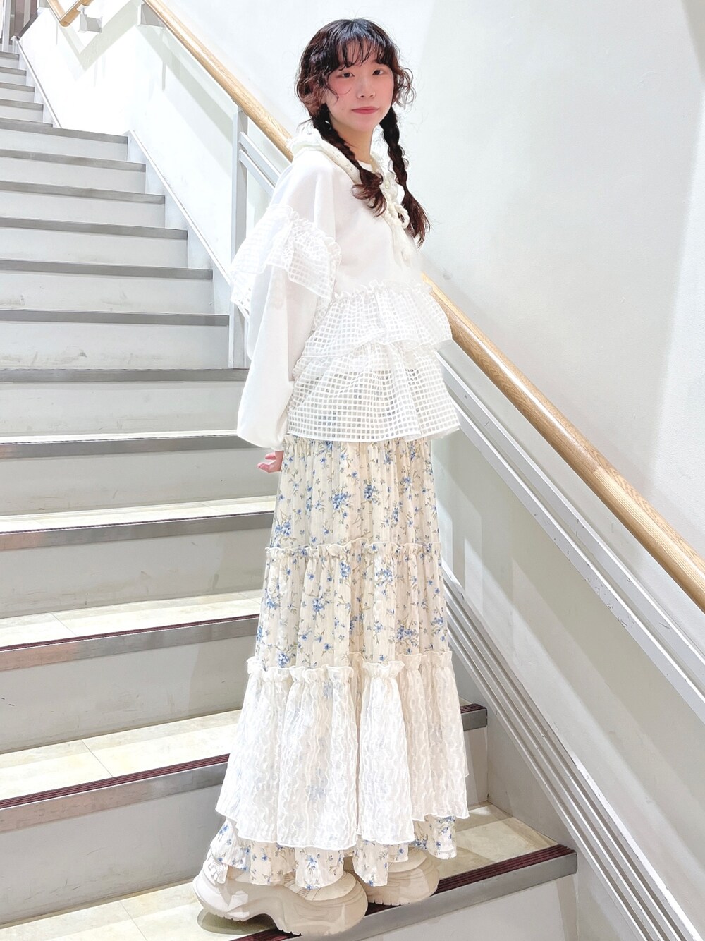 チェック柄のフリルがポイントのトレーナー。 ゆったりしたサイズ感で楽ちんですが、デザイン性が高いので手抜き感が出ないところがうれしいポイント。 首元がシンプルなのでつけ襟などを合わせて、アレンジしていただくのがおすすめです☺︎ 私はボンネットをフードのように付けて、甘すぎない雰囲気にしてみました♡ 首元が寂しい時に重宝するアイテムです。 お花柄のスカートはウエストぐるりゴムで、ノンストレスな履き心地。 ティアードですが落ち感のある素材を使用しているので、膨らみすぎず大人っぽく履いていただけますよ!