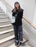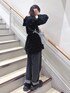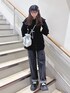 オールブラックコーデ🖤 キラキラと光る今っぽさ全開のブラウスは、大きな襟で顔を小さく見せてくれます! チュニックはさりげないリボン柄なので、柄物のお洋服と合わせてもうるさくなりません♡ 後ろのリボンで身幅を調節出来るので、体型問わず綺麗に着用していただけますよ! リボンがたっぷり付いたパンツは、身長155cmフラットシューズで1回折りして引きずらない丈感です。 ウエストは後ろがゴムになっているので、楽ちんに履いていただけます!