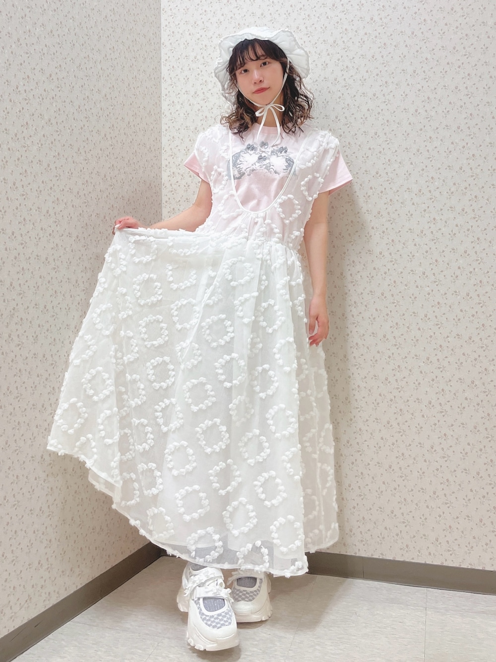 ぽこぽこふわふわ、珍しい生地を使用したレイヤードワンピース。 合わせるインナーによって、暑い季節も寒い季節も着用していただけます! ウエストはゴム仕様になっており、楽ちんに着ていただけますよ♡ 猫ちゃんがずらりと並んだTシャツは、コンパクトサイズでジャンスカやキャミワンピの中に着るのにぴったり。 袖幅は広めなので、二の腕が目立たないところもおすすめポイントです。 ワンピースに合わせて、立体素材のハットを被ってみました♡☁️