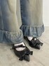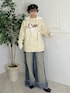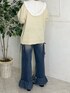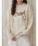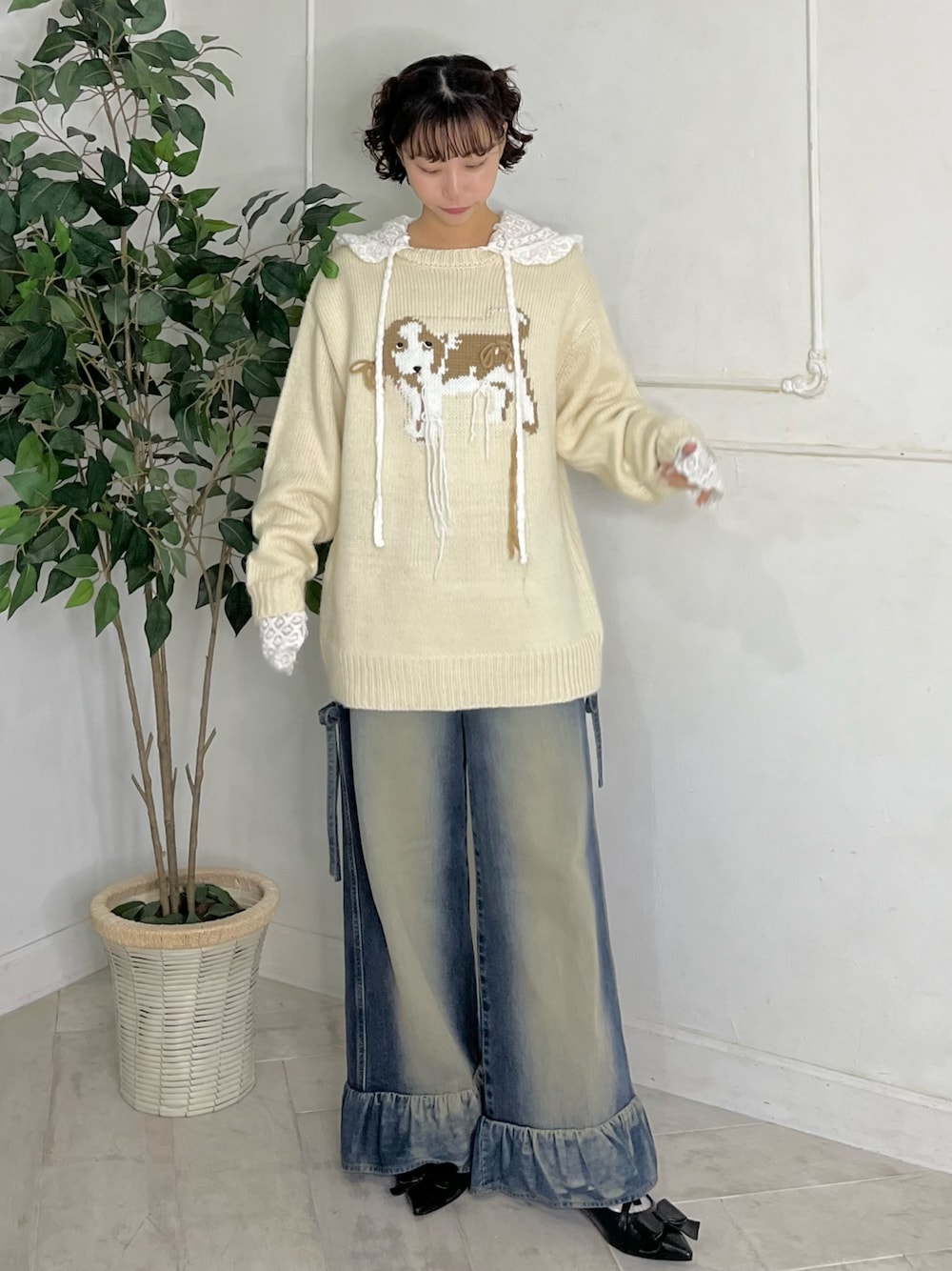 ヴィンテージライクな犬ニットは、ルーズなサイズ感でおしりまですっぽりと隠してくれます。 袖幅や身幅もゆったりとしているので、レイヤードも楽しんでいただけます。 デニムパンツは太めのシルエットで、体のラインを出ないところがおすすめポイントです! ウエストのリボンは外していただくことも可能です。