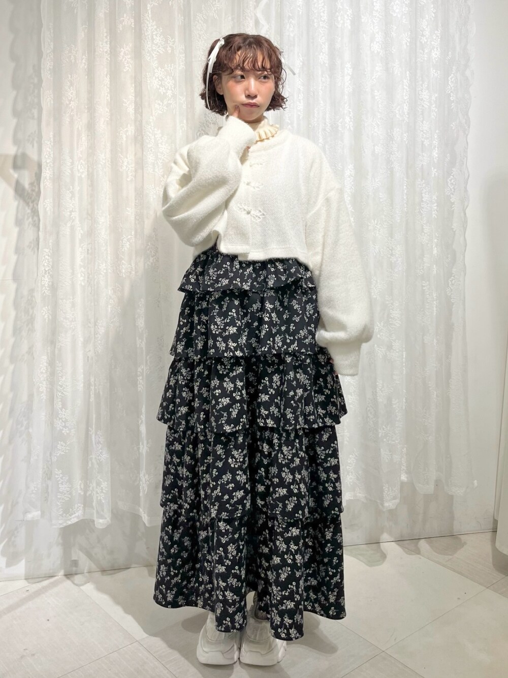 ボリュームたっぷりのティアードで、体型カバー力抜群のワンピース。 ブラウスを合わせてガーリーにも、リブニットを合わせて大人っぽくも着用していただけます。 上からスウェットやカーディガンを合わせて、スカートのようにも着ることが出来ますよ!♡ 中に着たリブニットは伸縮性があるので、締め付け感が無くて◎。 チャイナカーディガンは、ショート丈なのでスタイルアップ効果抜群です!