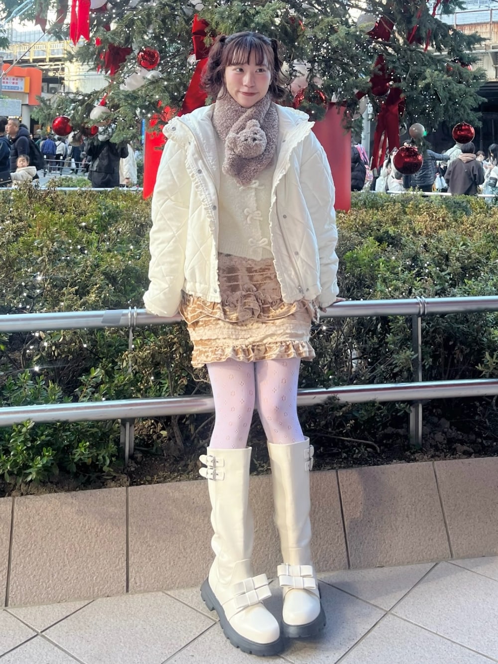 クリスマスコーデ🎄♡♡ 中綿たっぷりで暖かいキルティングジャケットは、裾のドロストで丸みを帯びたシルエットにすることも出来ます。 カーディガンはもちもちとしたブークレ素材を使用しており、伸縮性もあるため着心地抜群! 前を開けて羽織としても、閉めてトップスのように着用しても○。 くまちゃんのマフラーは、細身の作りなので首元すっきり楽に付けていただけます。 付けない時はカバンに付けておくことも出来るので、無くす心配の無いアイテムです!♡🐻️