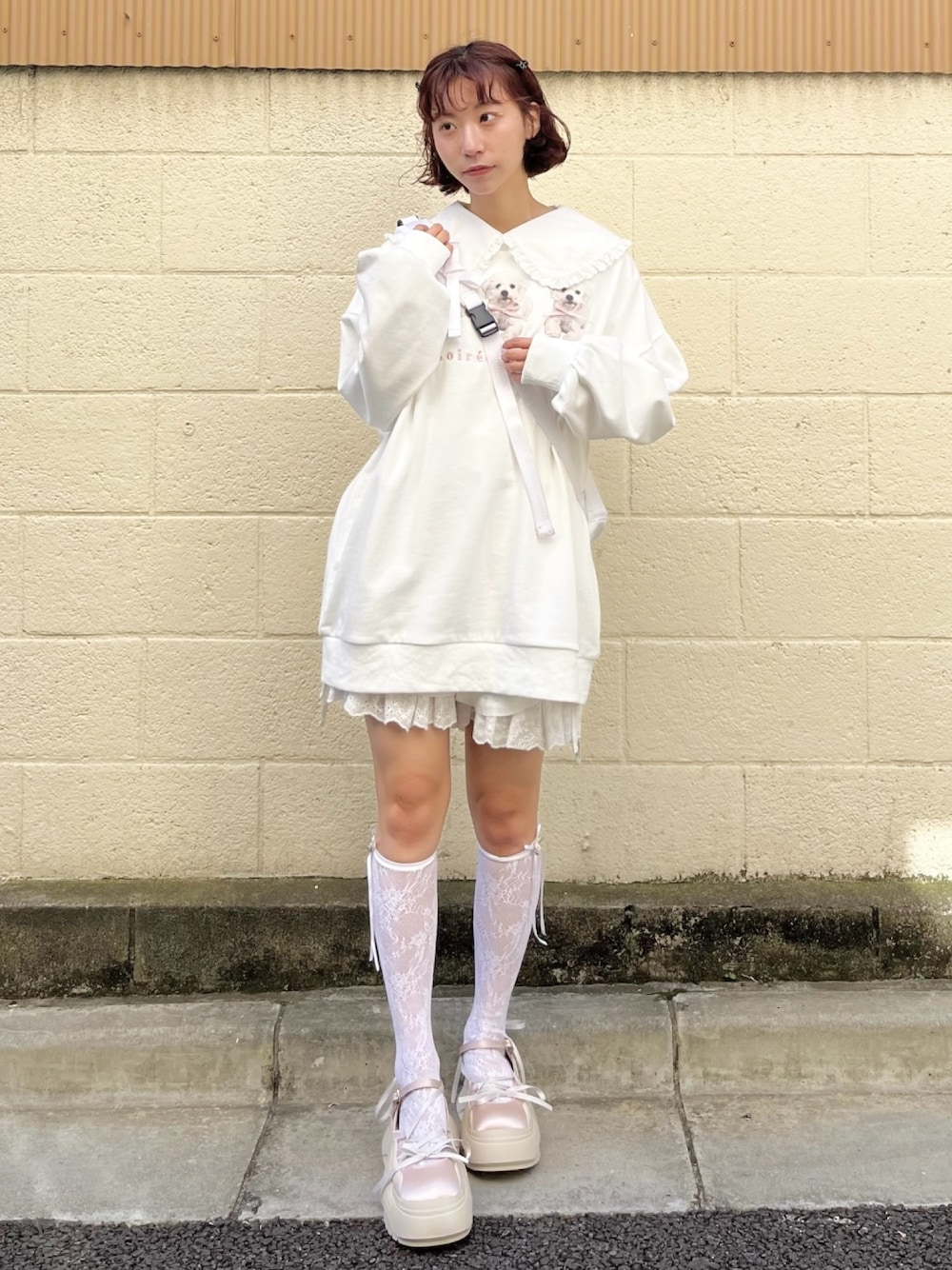 愛らしい子犬が3匹並んだスウェット♡ おしりがすっぽりと隠れるオーバーサイズなので、低身長さんはミニワンピース感覚で着ていただけます。 私は更にガーリーにしたかったので、中にブラウスを着て襟を出してみました! 襟が大きすぎず小さすぎない、絶妙なサイズでスウェットのデザインが隠れないのが嬉しいポイントです。 ワンショルダーバッグは、A4もすっぽりと入る大容量でちょっとしたリュック感覚でお使いいただけます。 スニーカーはサテンやリボンでガーリーなデザインなので、甘めのコーデにもマッチします♡