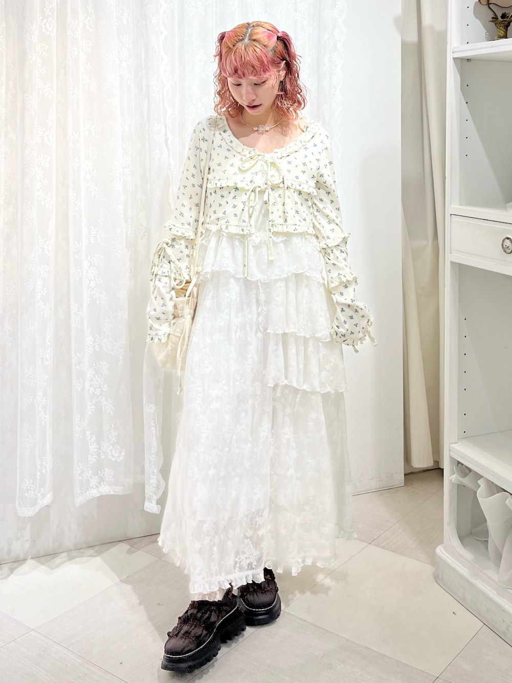 オケージョンにも活躍する、総レースワンピ。 丈は肩のリボンで長さの調節が出来るので、低身長さんでも安心して着用することが出来ます。 花柄のボレロは首元が広めに開いているので、大人っぽく印象になります。 可愛らしく着たい時は、ブラウスとのレイヤードがおすすめです♡