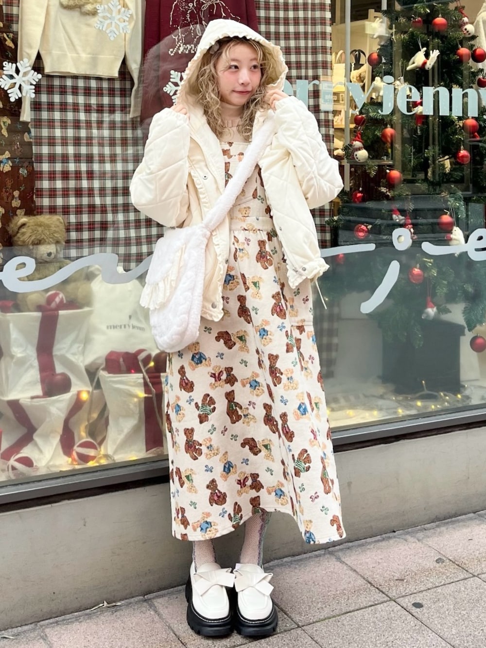 冬のお出かけにおすすめのコーデ♡🐻 中綿たっぷりのキルティングジャケットは、暖かく楽ちんに着用出来ます。 裾のドロストを絞って、丸みのあるシルエットにしても🙆🏻♀️。 くまちゃん柄のジャンパースカートは丈の調整が出来るので、身長問わずどんな方にも可愛く着られます。 ふわふわのショルダーバッグは、荷物を沢山入れても肩が痛くならないところが嬉しいポイント!