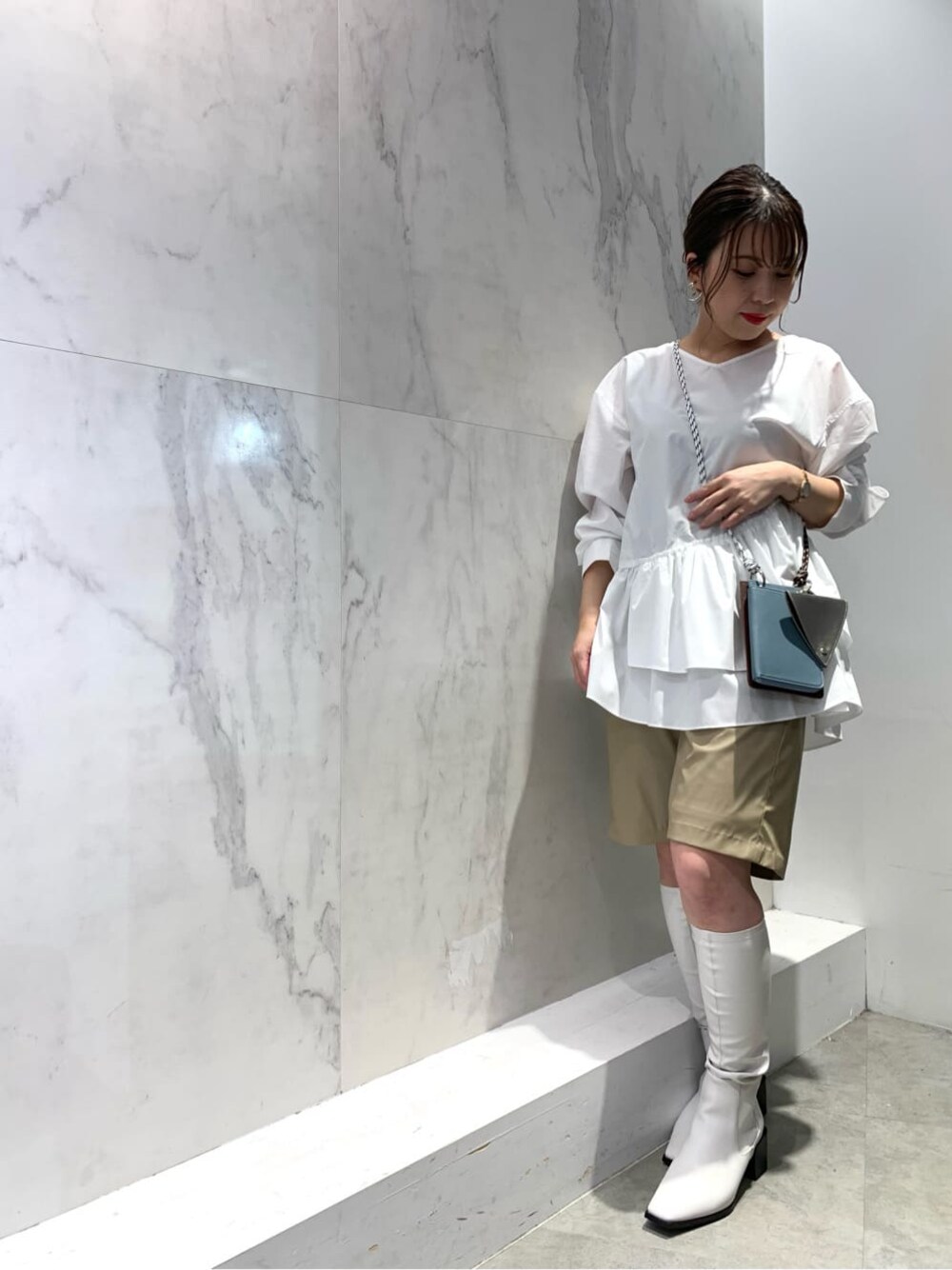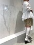 【着回しコーデ】パーカーとセットになっている、中のブラウスを着回し◡̈裾のギャザーデザインが可愛くて、1枚でオシャレ見え◎!おしり周りをしっかりカバーしてくれて、スタイルUP効果も*̣̩⋆̩ レザーのハーフパンツに、伸縮性のあるホワイトのロングブーツを合わせた大人モードスタイルに仕上げました。