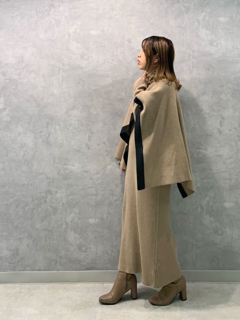kaho(ELENDEEK)のワンピース「LINE PONCHO SET KNIT OP」を使ったコーディネート