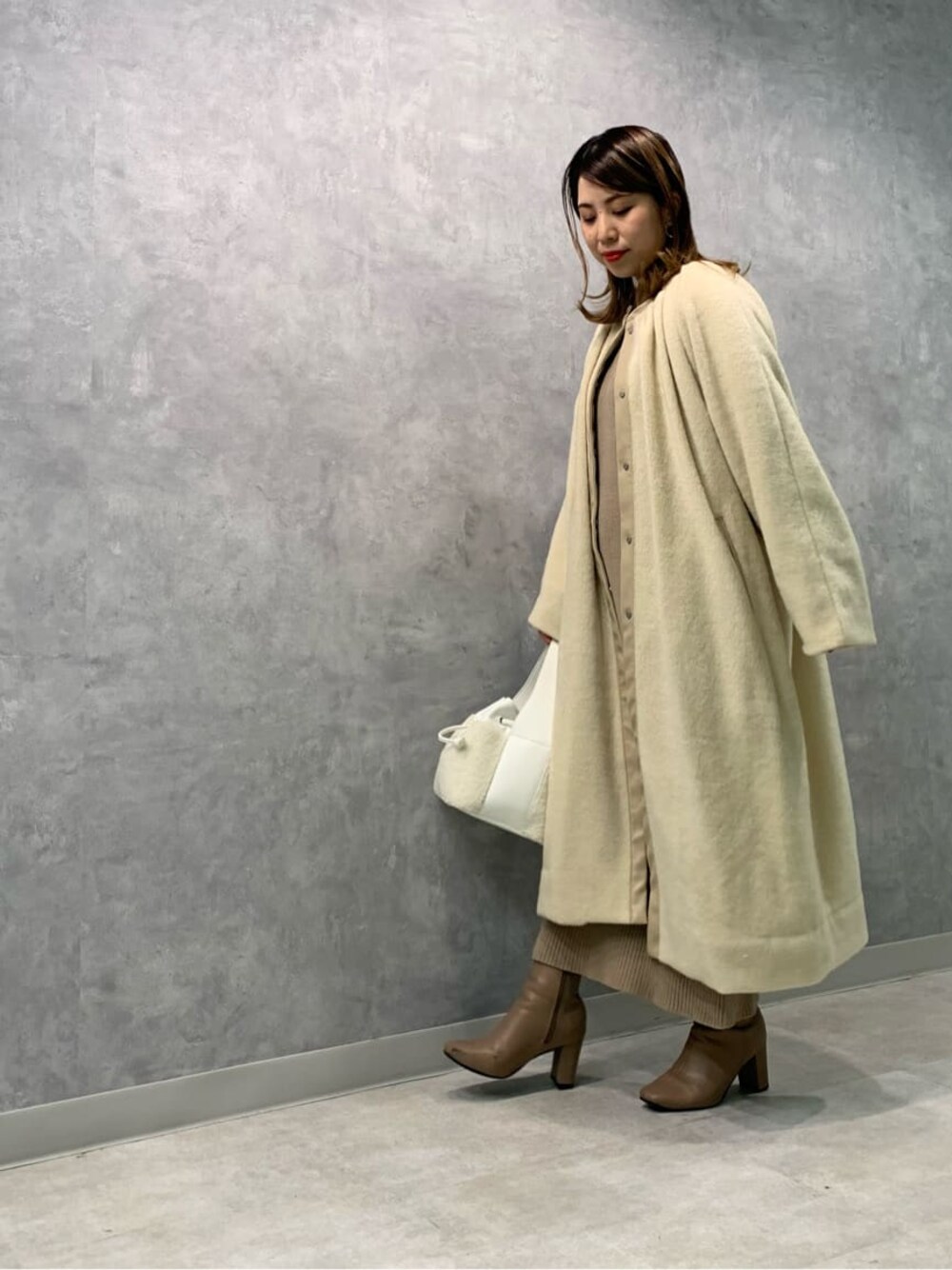 エコシャギーのコートでソフトエレガンスなコーデに仕上げました◡̈ 毛足が短いので、ゴージャスな感じではなく日常使いしやすいデザイン◎首周りや背中のギャザーが華やかな印象に見せてくれるので、1枚で着映えするコートです。