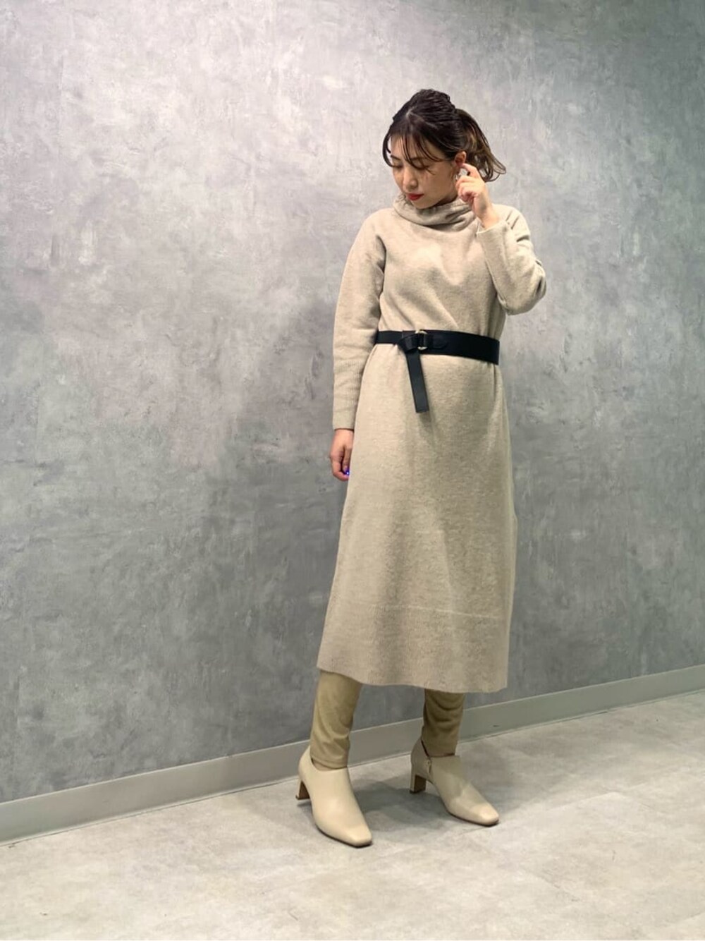 軽い着心地のニットワンピースで、ふわふわな肌触りが気持ちよくストレスフリー。しかもお洗濯可能なのでお手入れのしやすさも嬉しいポイントてす。 サイドのスリットが女性らしさを演出。ロングブーツ合わせもオススメですが、今回は 同色のレザーレギンスを合わせて大人のレイヤードスタイルに仕上げました。