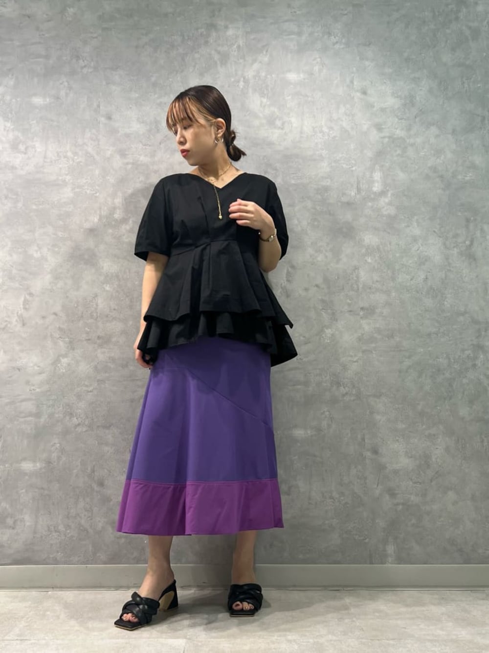 重ね着風のトップスのため、1枚でお洒落が叶う楽ちんアイテム。 プリーツデザインでお尻もカバーしてくれて、後ろ姿まで着映え効果抜群です◎! 裾の長さに前後差があるため、インをしなくてもバランスが取れて、お尻も隠せる長さで安心できる着丈です。 パープルのマーメイドスカートを合わせて、レディライクなコーデに仕上げました。