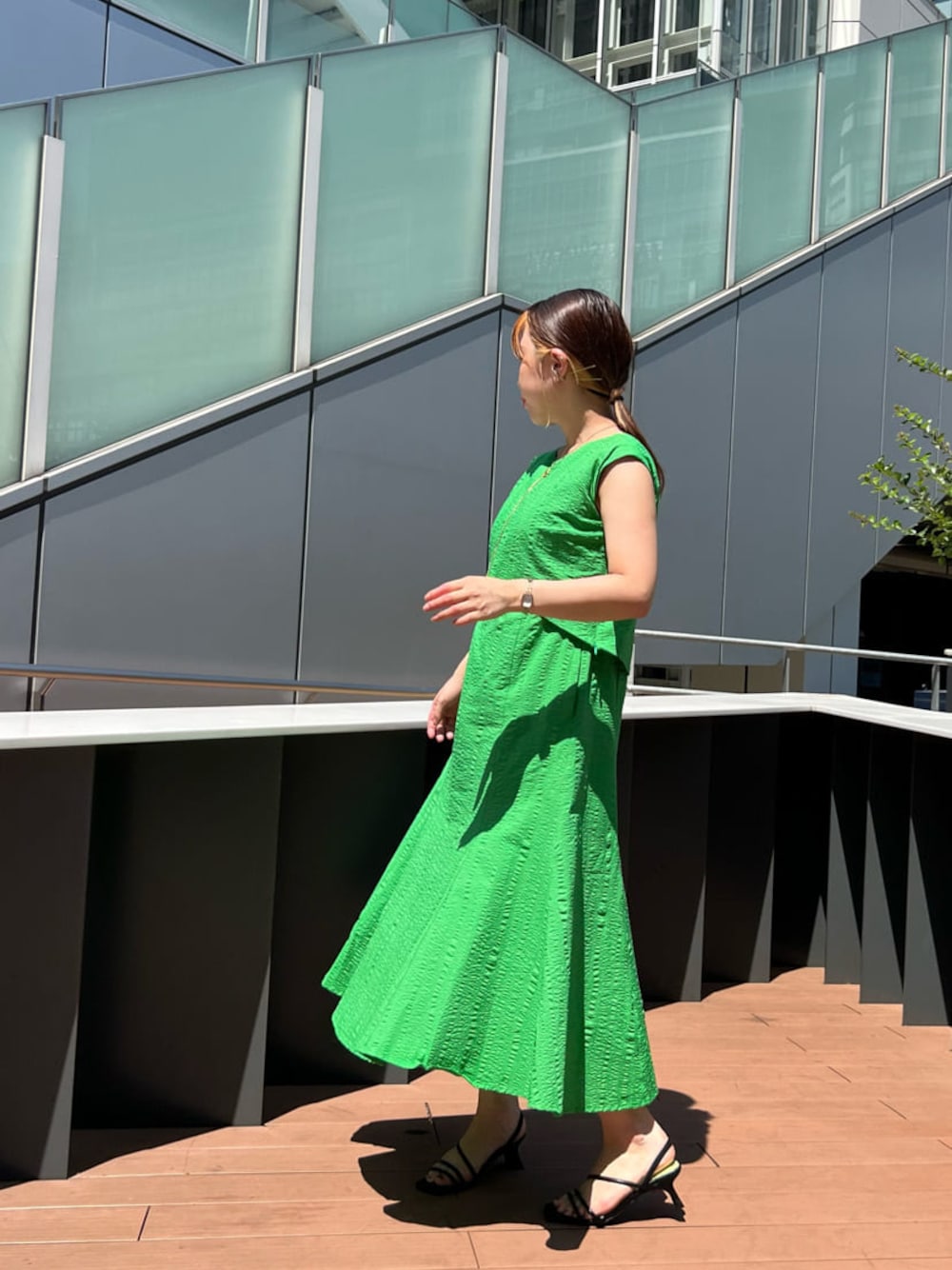 鮮やかなグリーンの色味がパッと目を引く1枚。 凹凸感のあるジャガード素材が、柄のように見えて華やかなデザイン。締め付け感なく、涼しく着用できるため夏にぴったりのアイテムです。