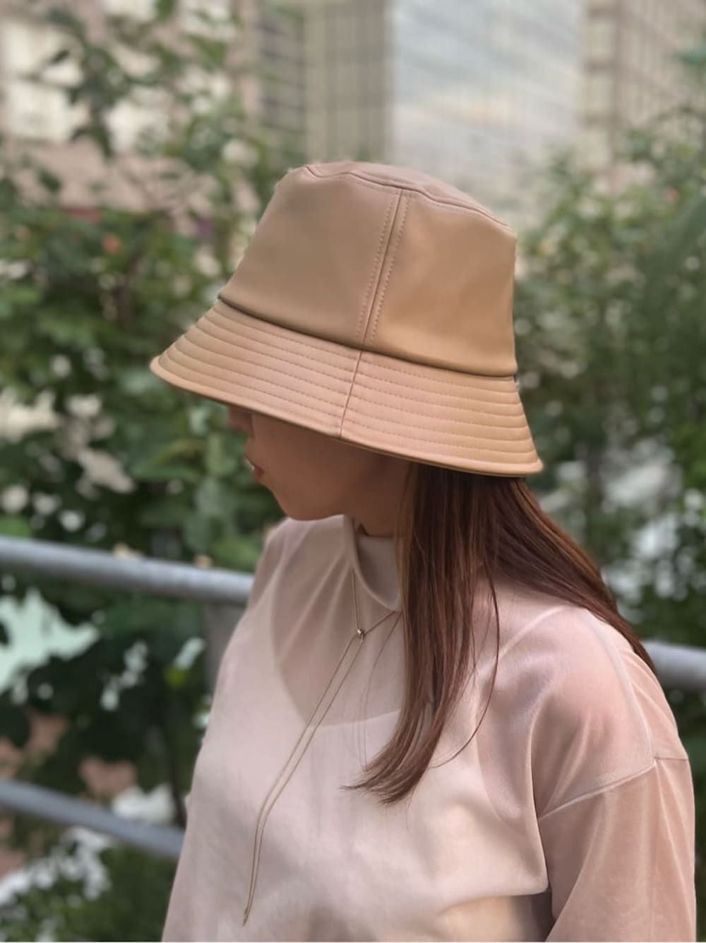 フェイクレザーの素材感が上品で大人な印象に格上げしてくれるバケットハット。柔らかく、締め付け感もないのでストレスフリー。シンプルで合わせやすいデザインなのでデイリー使いしやすいです◎。