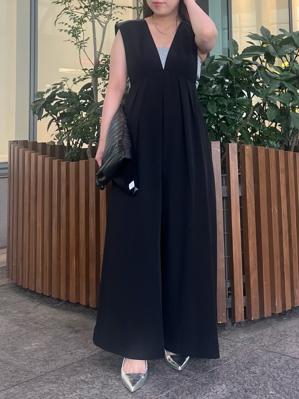 オケージョンコーデ 【コンビネゾン】 着るだけでスタイルアップして見える!!FUJIKOさんが細部までこだわり抜いた逸品✨ハイウエストで脚長効果抜群なのに、お腹周りはゆったりで産後の体型もしっかりカバーしてくれました👍🏻 一番カッチリ見せてくれるblackはお呼ばれシーンや食事会などにピッタリです。 【ベアパッドキャミソール】 お胸のボリュームを抑えたい方にピッタリなベアトップ。上端とアンダーをしっかりゴムでホールドしてくれて安心感◎。パッドが中でズレないのも嬉しいポイント。 【シューズ】 シルバーでコーデに華やかさをプラス。ポインテッドトゥでキレイめな印象に👠ふかふかのインソールで履きやすく、どこまでも歩いていけそうな印象✨ 【バッグ】 ノートパソコンが入るほど大容量で荷物が多い方にもオススメ。光沢感があるプリーツバッグかキレイめコーデにもマッチします!
