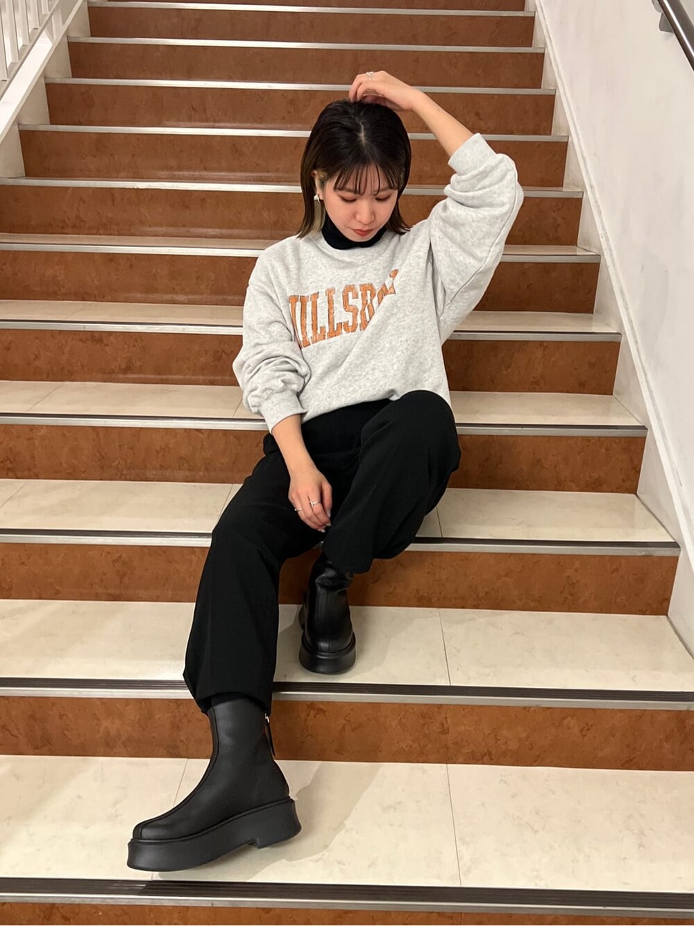 \\ スウェット × タックパンツコーデ // ヴィンテージ感のあるロゴがPOINTのスウェットは、カラー展開が全色可愛い♡ 部屋着っぽくなりがちなグレーのスウェットも、スウェット以外のアイテムを黒でまとめることで、コーデがグッと締まってお洒落見えします♪♪ 新作のブーツも厚底で、後ろにZIPがついていて、脱ぎ履きしやすいです! スタイルアップにもなるので、ブーツは冬のマストアイテムです*.°