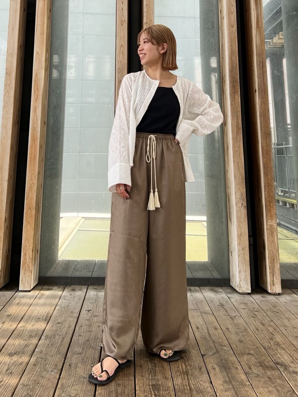\\ 大人サテンパンツコーデ // インドメイドの繊細なレースがPOINTの柔らかいシャツを羽織りにして、ボトムスはサテンパンツで、大人なムードに*°.・ インナーは、パット付きキャミを合わせて首元を見せる事で抜け感が出るので、ブラウスやシャツのインナーにオススメです♪ サテンパンツも、カラー次第で印象が変わるので、カラーを変えても素敵です☆" ウエストはゴムで楽なのにお洒落見えするサテンパンツは夏に1着は持っておきたいitemです☺︎