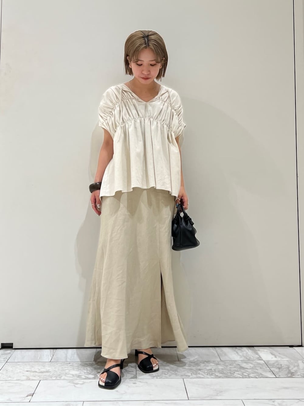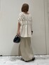 \\ ギャザーデザインブラウス × スリットスカートコーデ // 大人な綺麗めコーデなので足元はレースアップサンダルで、小さめのbagで合わせてみました♡" アイボリーのワントーンコーデにしてSET UP風に☺︎ ブラウスとスカートの素材も、リネンなので夏らしく統一感が出ます◎ ブラウスは、前が少し短めで、後ろはヒップが隠れるくらいの長さなので、横から見たシルエットも可愛いんです♪