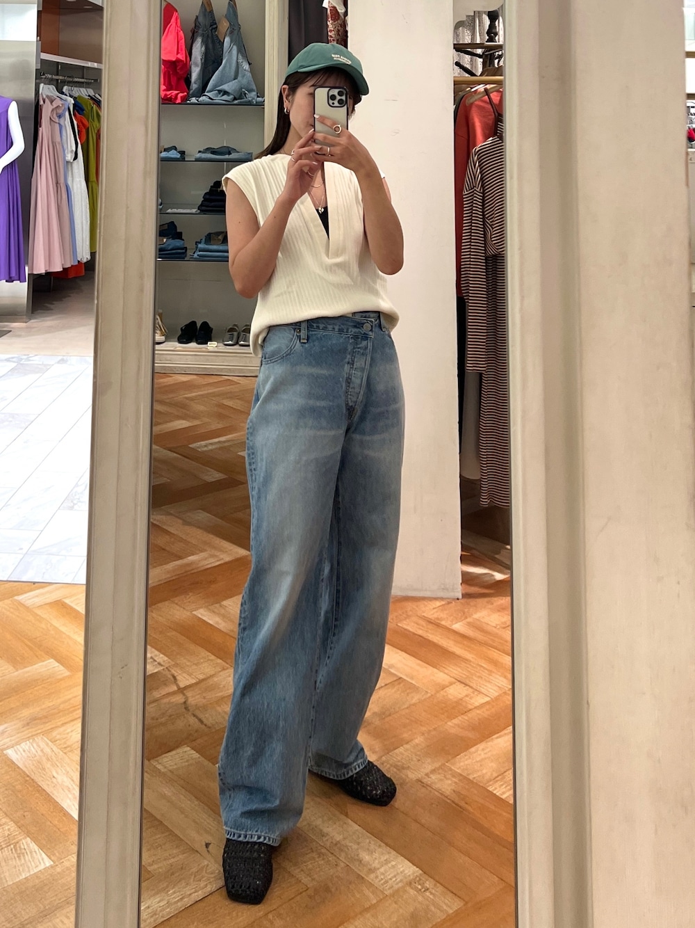 \\ instagram → @momoka_segawa_ // 夏のカジュアルcode🧢 《TOPS》 深めのVネックが大人っぽくて スッキリ見えるノースリトップス🌿 フレンチスリーブの形なので 二の腕の1番気になる部分を しっかりカバーしてくれます💯 脇のところも詰まりすぎてないので 二の腕細見え効果もあり👍🏼 秋冬はインナーを長袖に変えて ベストとして使える万能トップスです🎶 《DENIM》 お問い合わせ多数頂いており、 再入荷前から大人気!👖 シンプルなトップス合わせで いつものコーデも、 このdenimを履くと違った雰囲気に…♪♪ 裾は長めなので、 ロールアップして 履いて頂いても可愛いです!!🙋🏼♀️ 出会えたらラッキー🌟 すぐ完売する幻のdenimです👏🏼 モノトーンコーデで物足りない時に カラーキャップを差し色に被るだけで お洒落見えします🦖♡ カジュアルダウンしすぎないように アクセは多めに付けてます◎