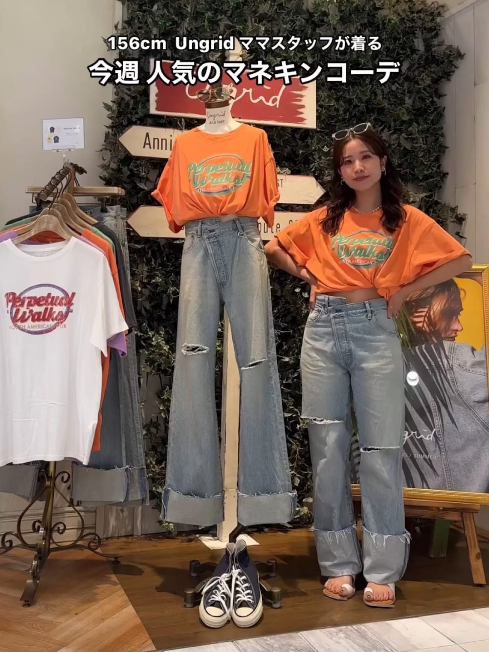 \\ instagram → @momoka_segawa_ // リールコーデ詳細🧵 《TOPS》 毎年大人気の Ungridのツアーロゴシリーズ🎶 今年も可愛いデザインが 入荷しておりますっ🌞 全体的にゆるっとしたシルエットと 薄めの生地感で、 夏も快適に着ていただけます😉 ヴィンテージ感が可愛いので 色違いで持っていても間違いなしです✌︎✌︎ 《DENIM》 見た瞬間、即決👖💥 色味もデザインも💯な 夏に映える今季イチオシdenimです🌈 360度どこから見ても可愛い♡" クラッシュデザインも 太ももらへんに入っているので 肌がそんなに見えないので 若くなりすぎない!✊🏼 何歳になっても履ける クラッシュデニムです✨ ロールアップの幅を変えて 裾直し出来るので 身長問わずに履いていただけます☺️