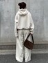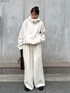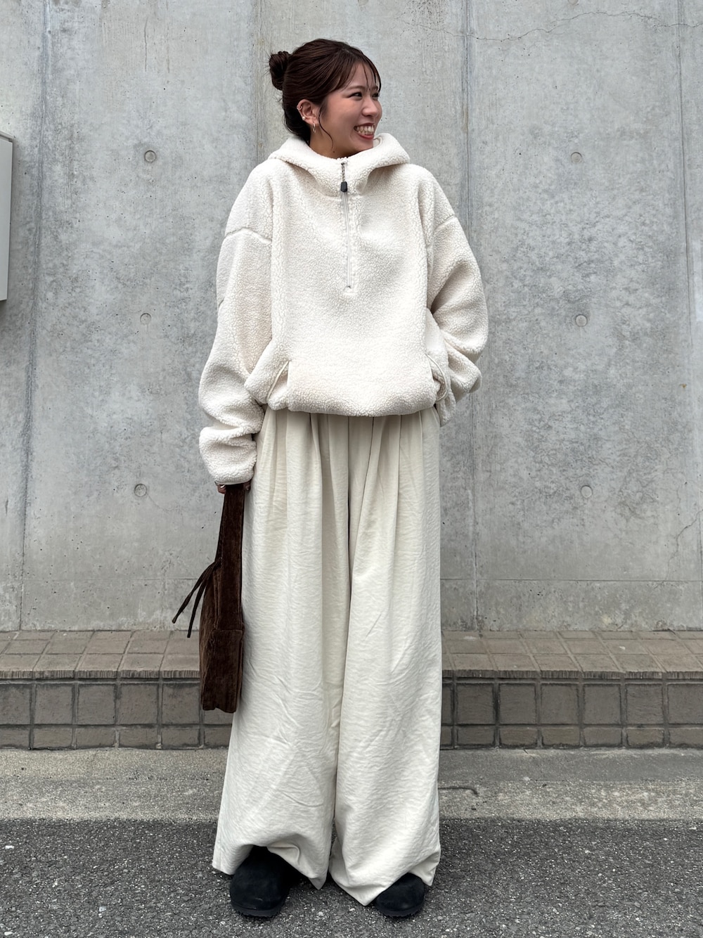 \\ instagram → @momoka_segawa_ // 《TOPS》 モコモコの素材が今季らしい! トレンドitemです✨ ポリエステル100%なので、 サラッと軽く手に取りやすいです🫰🏼 首元のジップを上げると はいねっくにもなるのでマフラーいらず!🧣 フードをアウターの外に出しても可愛いです🥺 《BOTTOMS》 ピーチ起毛素材 ( 薄い桃の皮のような素材) が、今季らしく綺麗めコーデに使えます🙆🏻♀️ ウエストは、総ゴムで 紐で絞れる仕様になっているので 体型問わずに履けます💯 裏地も足元まで入っているので、 アイボリーでも透け感なく着用可能◎ 156cmで床着くくらいの丈です☺︎