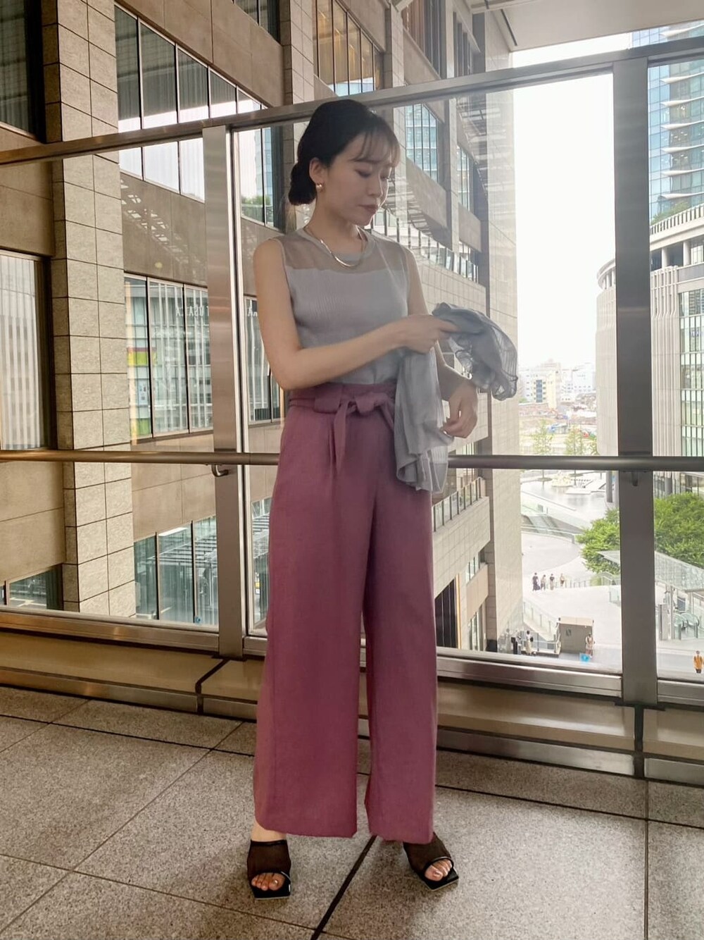 全身セールになったアイテムのコーデを組んでみました! シアー素材のアンサンブルが程よい肌見せを叶えてくれるので、夏にぴったり。 羽織とインナーがセットになっていると、コーデも組みやすいので1着あるととても便利です。もちろん羽織はワンピースやお持ちのキャミソールなどにさらっと羽織っていただけます。 ボトムスに選んだのは麻調の素材と明るいピンクカラーで夏らしさを演出してくれるパンツ。 こちらのパンツはシルエットが本当に綺麗でお尻周りをスッキリ、足を長く見せてくれます。太めのウエストサッシュが付いていることで細見え効果もバッチリです!