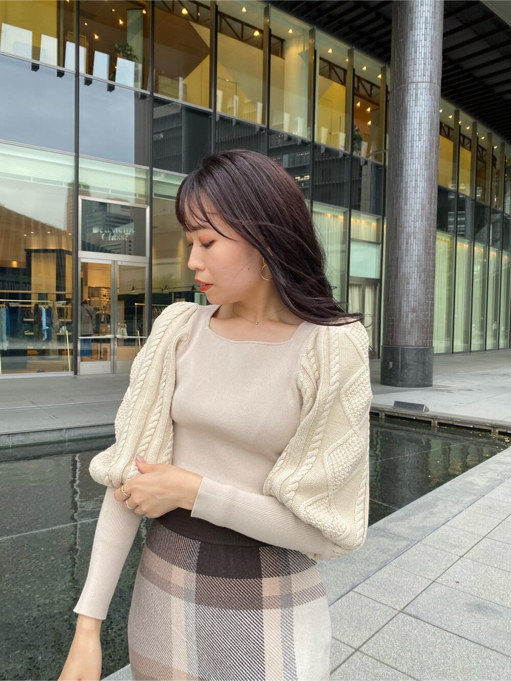 去年も大人気だったケーブルスリーブニットが骨格ストレートさんにも嬉しいスクエアネックになって再登場! 袖のボリューム感がたまらなく可愛い!ケーブル部分の切り返しが内側から入っているので肩周りがゴツく見えないので、ボリュームスリーブ好きだけど、肩幅が大きく見えるのが気になる方にもおすすめ! ボトムスには大きめのチェック柄が可愛いスカートを選びました。肉厚なニットで体のラインを拾いにくいのでぜひ体感していただきたい! プリーツデザインがおしゃれなトレンチコートを合わせて大人のデートコーデに。
