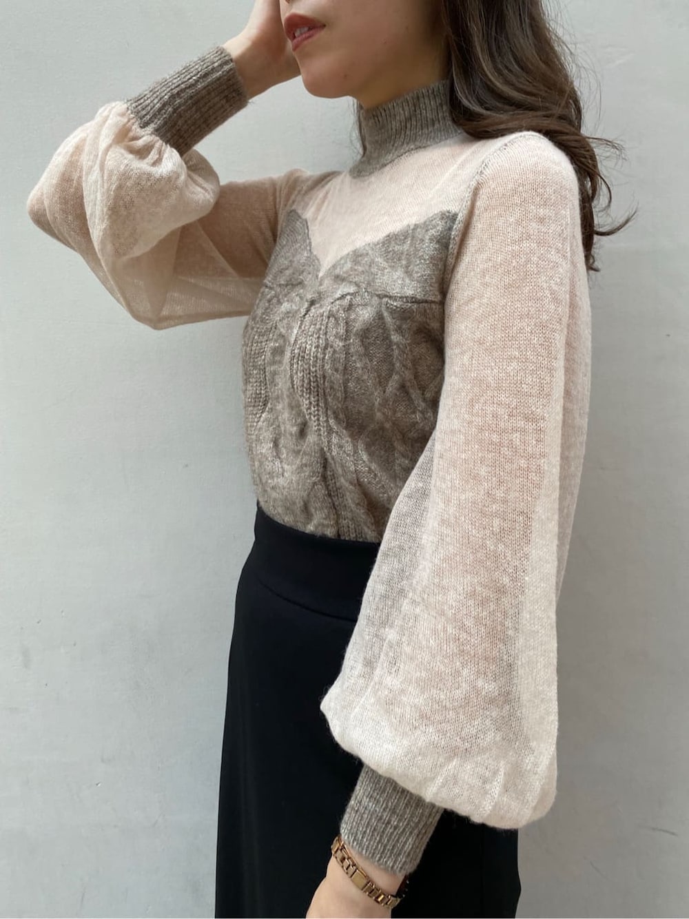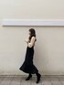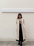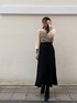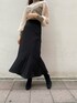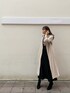 落ち着いたカラーのコーディネートながらもシアー素材のニットを取り入れて抜け感がプラスされたスタイリング。 秋冬はどうしても暗めの色を選んで地味になりがちという方は透け感のある素材を選んでみてはいかがでしょうか。 トレンド感のあるシアー素材はシンプルなボトムスに合わせるだけでおしゃれな印象になります! 私は切り返しから広がる裾が魅力的なスカートをチョイス。取り外し可能なサスペンダー付きなので、リブタートルなどのシンプルなアイテムとも相性抜群! 体のラインを拾わないマーメイドスカートのようなシルエットです。 コートは肩落ちしないジャストショルダーのノーカラーコート。ロングコートは着られてる感が出てしまったり、膨張して見えがちですが、こちらのコートはどんな体型の方にもすっきりと着て頂けます。ボタンではなく、カシメを使い高級感あるデザインに。