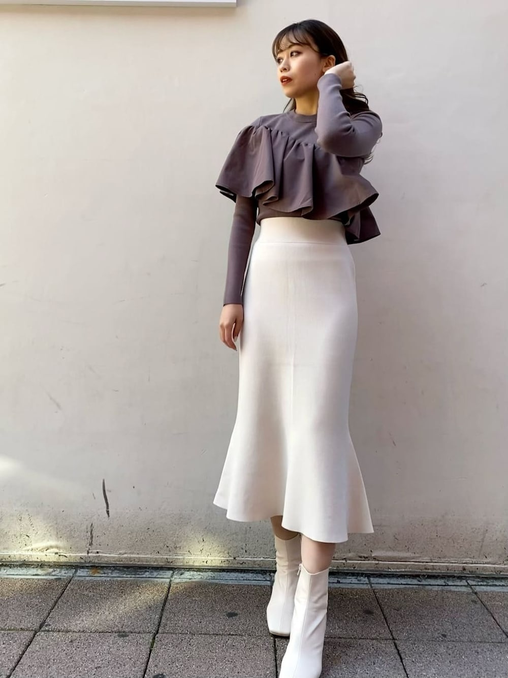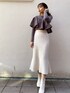 胸元の大きめフリルが体を華奢に見せてくれるトップス。フリル部分は異素材になっており、メリハリがあるため甘さ控えめに。 私はブラックを購入したのですが、パープルも華やかで可愛い◎ 普段はデニム合わせなどカジュアルなボトムスと合わせてますが、お出かけにはスカート合わせでとことん女性らしいスタイリングがおすすめ。 骨格ストレートの私はボトムスにはコンパクトなシルエットのスカートを合わせることが多いです。 今回はナローニットスカートをチョイスしています!