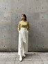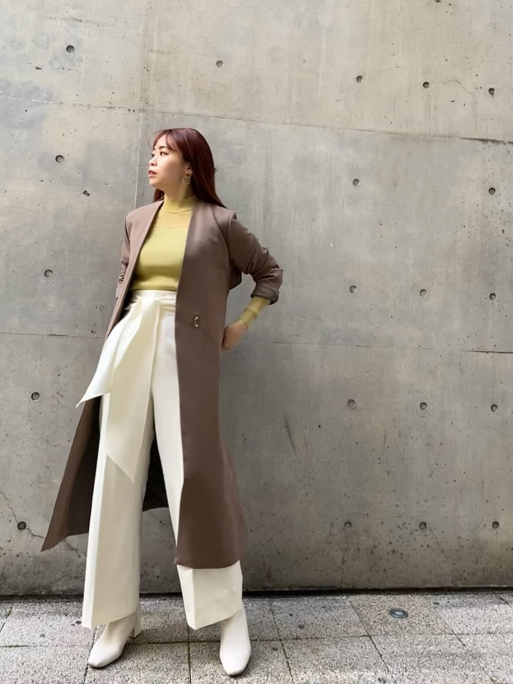 顔まわりのレースが華やかなトップス。私は春らしいイエローを選びました。 肌見せが女性らしいトップスなので、デニムなどのカジュアルなアイテムとも相性抜群。 太めのサッシュがポイントのストレートパンツはウエスト位置高めなので、スタイル良く見える◎綺麗めなデザインなので、オフィスにはもちろん、ラフにTシャツ合わせも楽しめます。 どんなテイストのスタイリングにも合うノーカラーのコートを羽織って、春のお出かけコーデの完成。 ノーカラーのスプリングコートってなかなかないですが、本当に万能で、秋にも大活躍します!