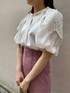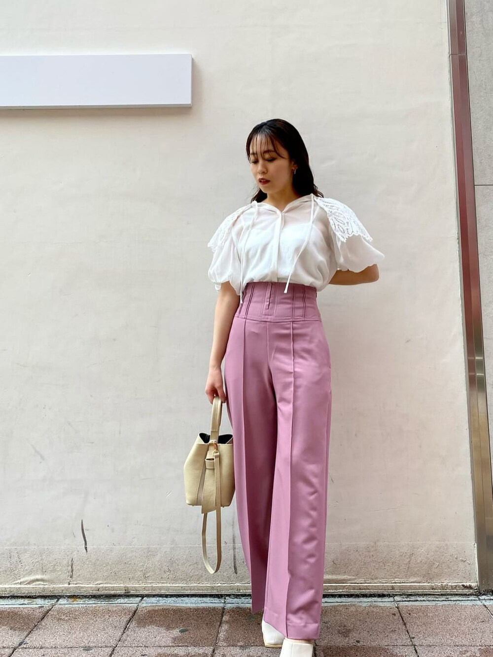 レースカラーのブラウスをパンツと合わせて甘さを抑えたコーディネート。 パンツはハイウエストで幅広な切り替えになっているので、骨盤の張りや太ももの張りなどが気になる方にも綺麗に履いていただけるシルエットです。 ブラウスは大きめの襟とボリュームスリーブが今年っぽくて可愛い!キャミワンピなどのレイヤードや、デニム、マーメイドスカートなど着回し力も抜群です◎