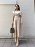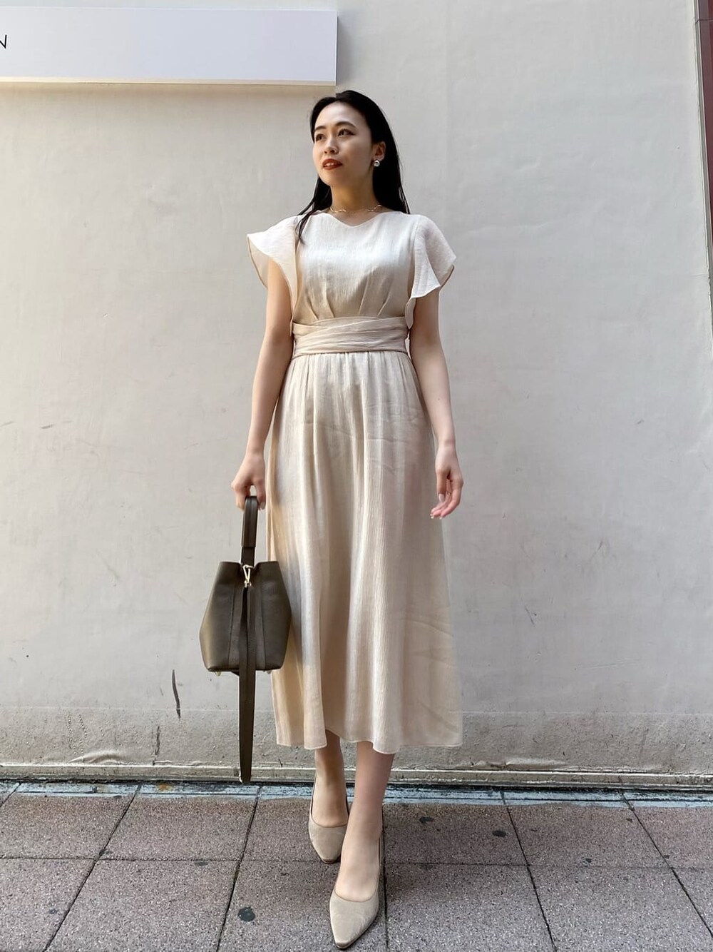 楊柳素材の涼しいワンピース。 後ろがゴムになっていて、着心地もとっても楽ちん。 最近はマーメイドやタイトなシルエットのワンピースが多く、自分の体型に合うものを探すのが難しかったのですが、これならサラッと体のラインを拾わず着れるので、夏に大活躍しそうです◎ 上品な色のアイボリーは顔合わせや、ちょっとしたお食事会などにもぴったりです。