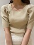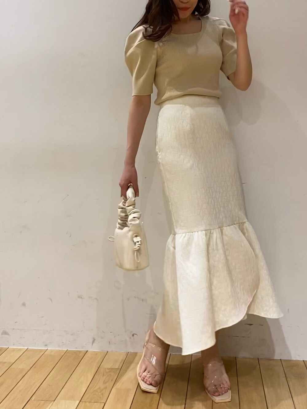 切り返しからふわっと広がるジャガードスカートを取り入れたコーデ🤍 白でも甘くなりすぎないハリ感のある生地なので、ラフにTシャツやスニーカーを合わせても◎ 今回私はラメが入ったトップスで華やかにスタイリングしてみました✨ スクエアネックと二の腕が隠れる袖丈が華奢に見せてくれる万能トップです🧚🏻♀️