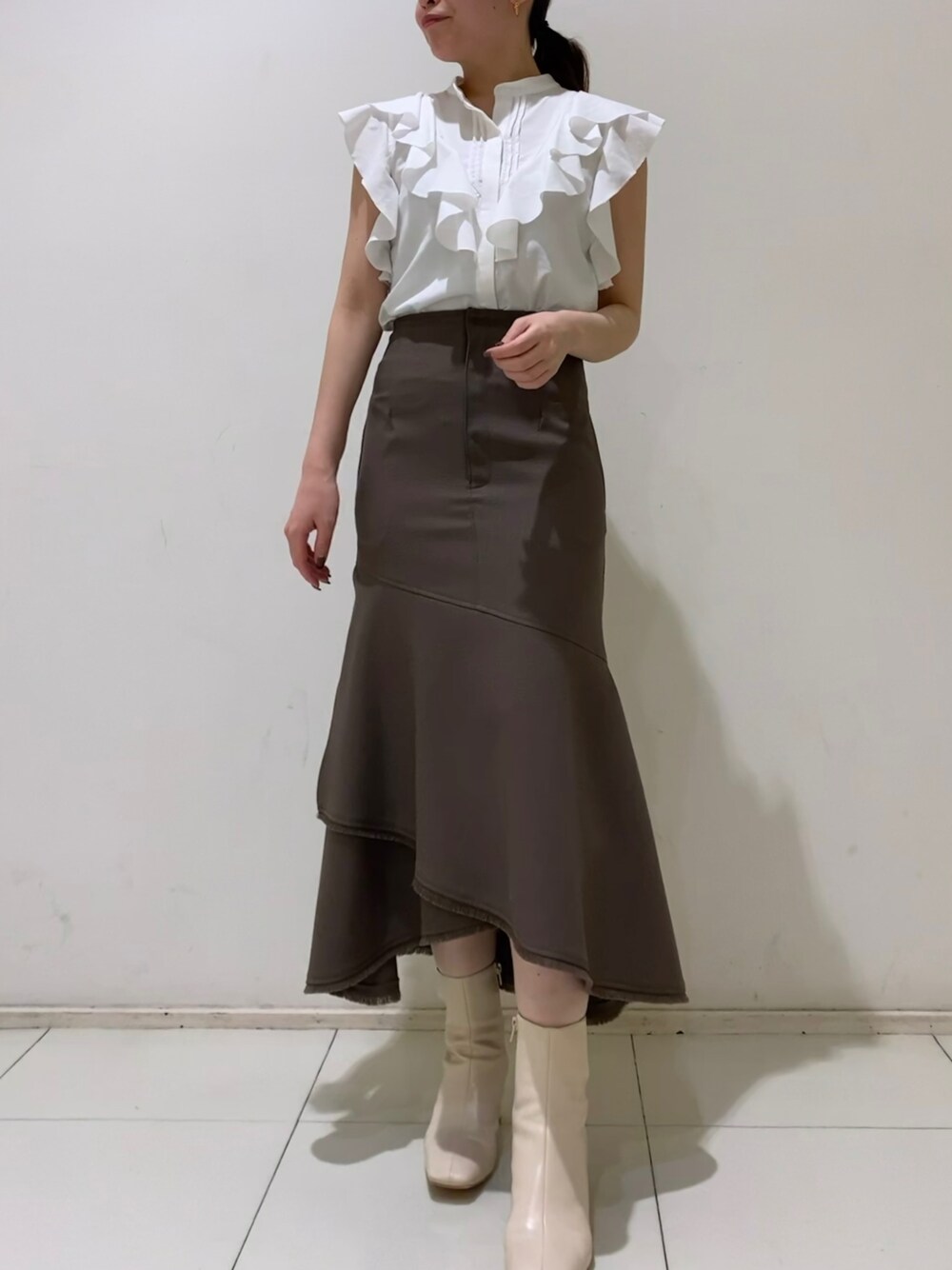 毎年人気のフリルブラウス♡ 甘すぎない程よいボリュームのフリルなので大人っぽく着て頂けます◎ 今回はフリンジデザインのマーメイドスカートと合わせてフェミニンに🌷