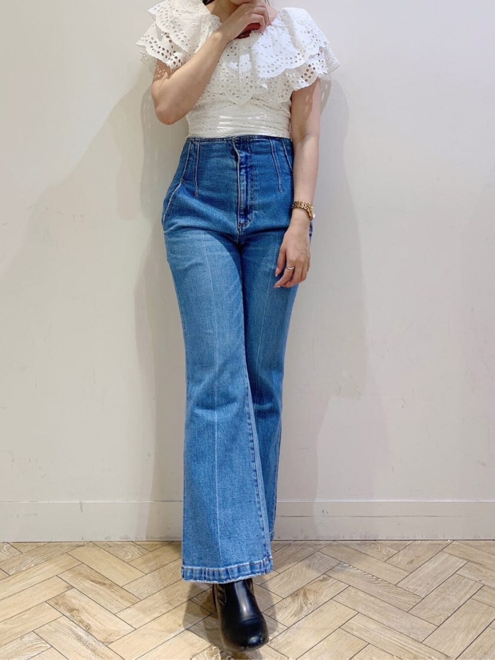 【MERCURYDUO×新希咲乃】 カットワーク刺繍ブラウス×デニムでフェミニンなカジュアルスタイルに✨ ブラウスはオフショルでも使えるデザインで、リボンは取り外し可能なので、外すとよりカジュアル見えしやすいです! ブラウスは着脱しやすく丈感が短めなので、ハイウエストパンツ合わせがおすすめです♪ デニムパンツは、ハイウエストなので脚長効果抜群でシルエットが綺麗な1枚です︎︎︎︎︎☺︎ フェミニンカジュアルがお好きな方にはこちらのコーデがオススメです︎︎︎︎︎☺︎