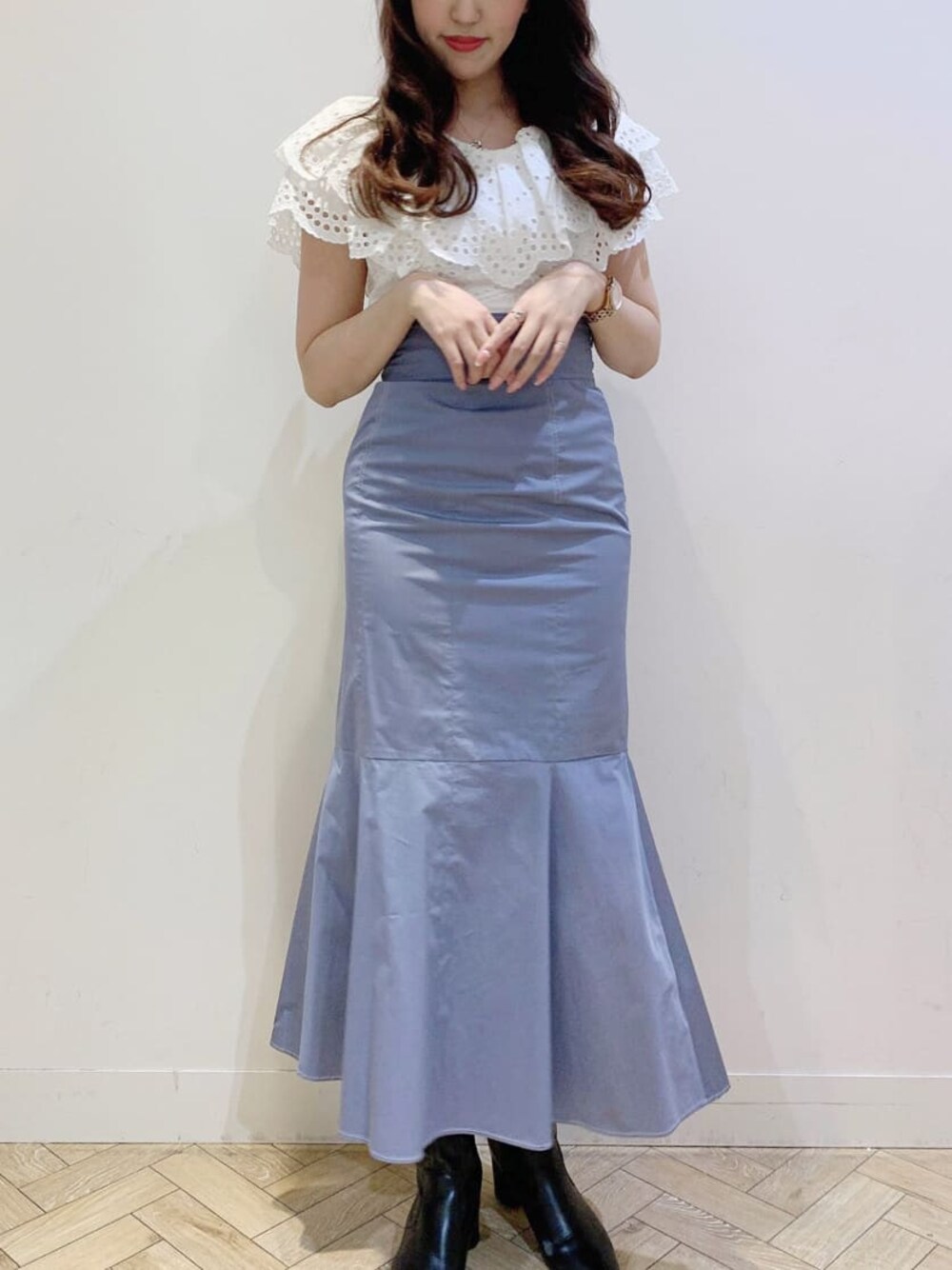 【MERCURYDUO×新希咲乃】 新希咲乃さんコラボブラウス×マーメイドスカートで360°可愛いコーデに仕上げました♡ ブラウスは、コットン素材でラッフルデザインなので華やかさアップ✨着回し力も抜群な1枚です♡ 合わせているマーメイドスカートは、タフタ素材でステッチが入っているのでカジュアルを抑えてくれるスカートです! また、同素材のリボンも取り外し可能なので、その日の気分で変えて頂けます✨ 新希咲乃さんコラボブラウスのリボンを外して、スカートにリボンを付けるのも◎! セットアップがフェミニン過ぎる方には、このコーデがおすすめです︎︎︎︎︎☺︎