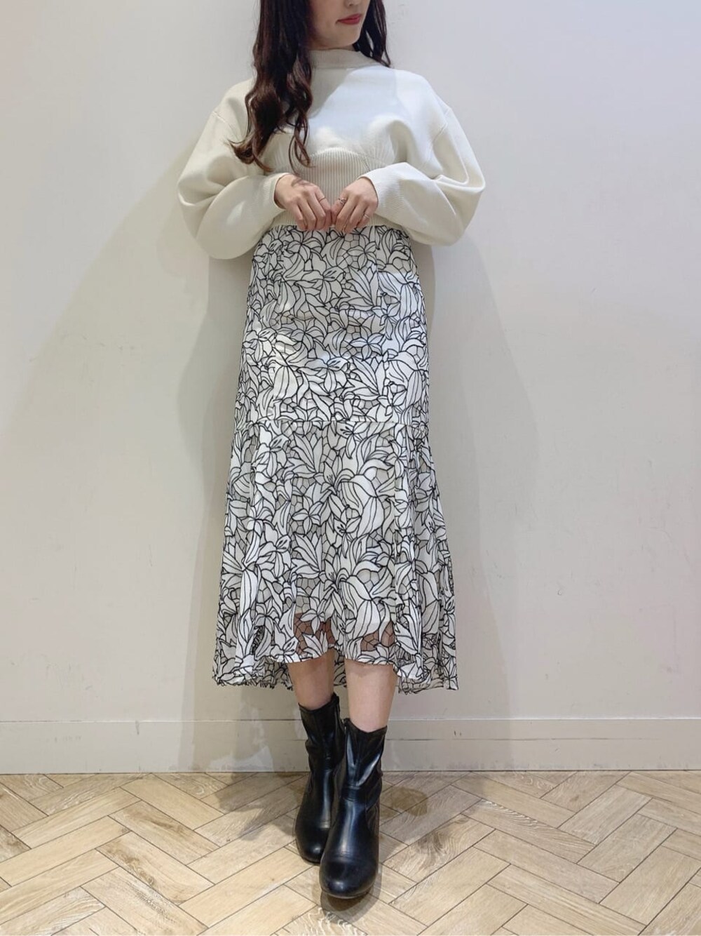 カットワーク刺繍ワンピース×ニットをレイヤードしたスタイリング✨ カットワーク刺繍ワンピースのウエスト位置が高めなので短めのニットで合わせて脚長効果を更にアップ♪ シンプルニットで合わせるとカットワークスカートが映えます♡ パーカーなどで合わせるとカジュアルスタイルにも◎! ニットは、膨らみのある厚さでスウェットぽさがある1枚︎︎︎︎︎☺︎ レイヤードスタイルはスタイリングの幅も広がるのでお勧めです♡