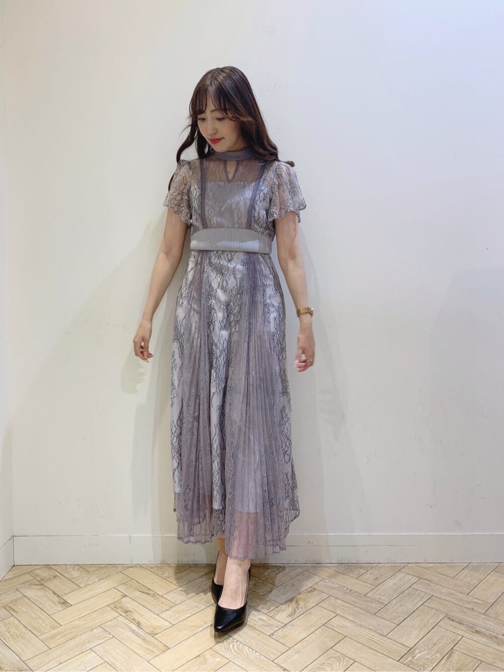 結婚式、パーティー、ディナーデートなどにピッタリなレースドレス♡ 春らしいラベンダーを着てみました♪ お袖のレースがふんわりしているので二の腕もカバーしてくれるので安心です✨ そして、胸下切り替えなのでウエスト周りもスッキリ見え、プリーツレースでメリハリのあるドレス♡ 首元は少し開いてるデザインなので上品さ、抜け感も演出してくれます♡ 足元は、パンプス合わせがオススメです︎︎︎︎︎☺︎
