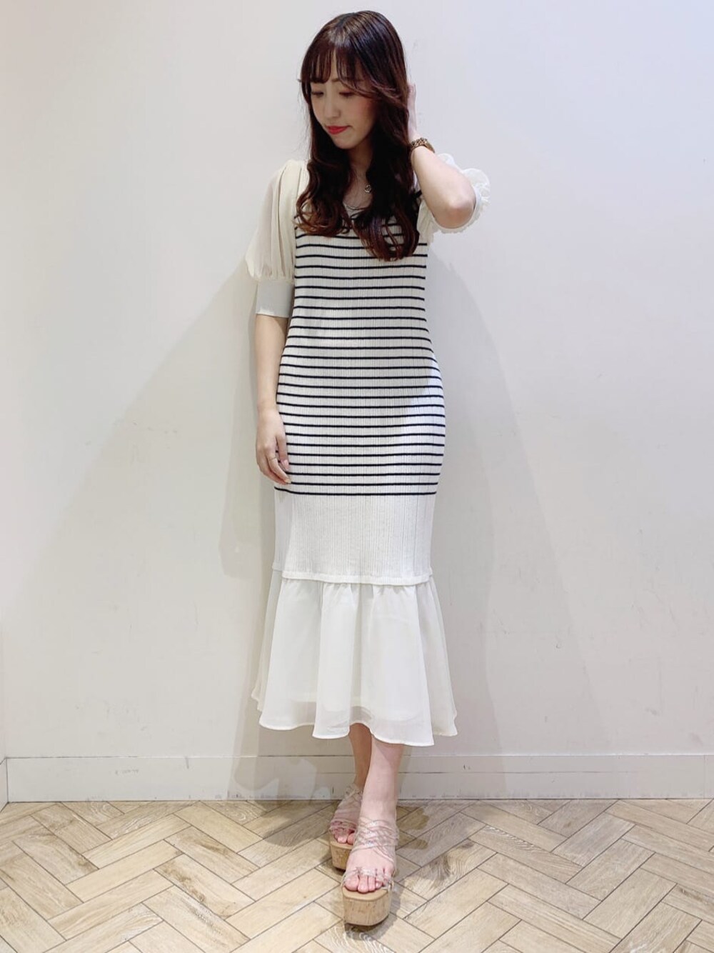 カジュアル見えしないボーダーニットワンピース♡ ふんわりしたお袖と裾にシフォンを使用しているので可愛さをアップしてくれるのがポイント♪ 着心地もとても良いので1枚でサラッと着やすく楽ちんです♡ ボーダーワンピなので足元はバランスを見てクリアのサンダルにしています✨ サンダルは、毎年大人気の神サンダル︎︎︎︎︎☺︎ 安定感があるので、長時間履いていても足が痛くならない優秀サンダル!! 困った時はこのサンダルを履けば足元からオシャレ見えバッチリです♡ また、フェミニン感を演出する為に、ライダースはアイボリーにしています︎︎︎︎︎☺︎